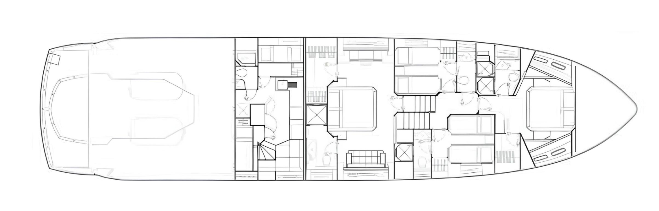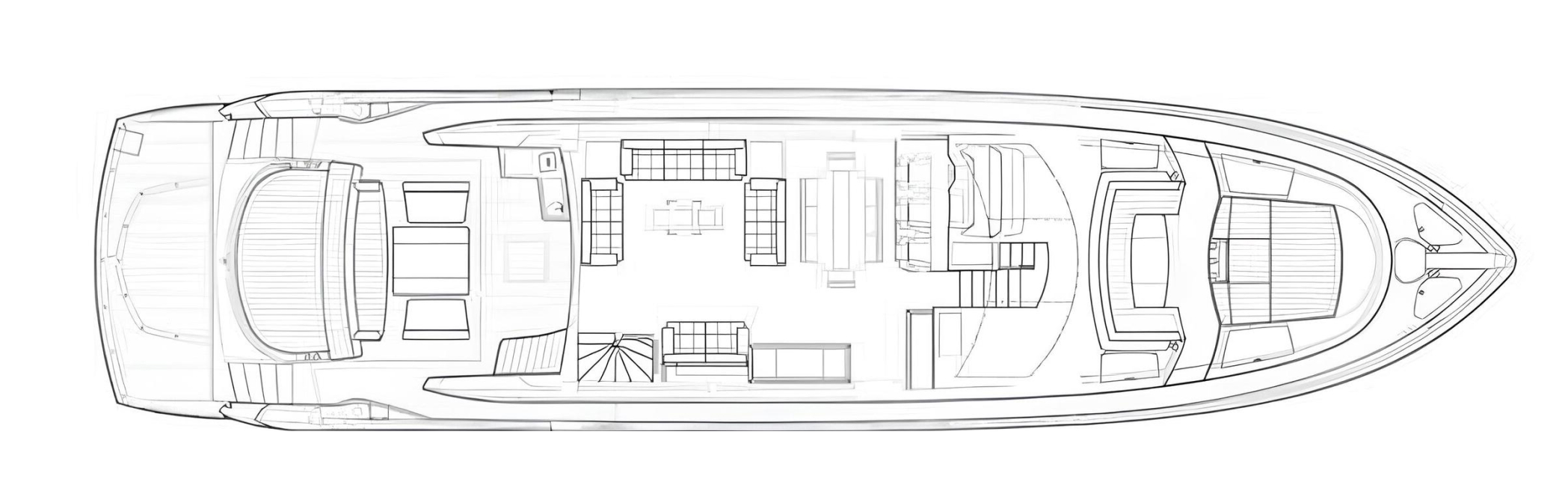 Главный салон и кокпит образуют единое открытое пространство благодаря раздвижной крыше, которое переходит в кормовую палубу. На флайбридже установлен пост управления и дополнительные зоны для отдыха.