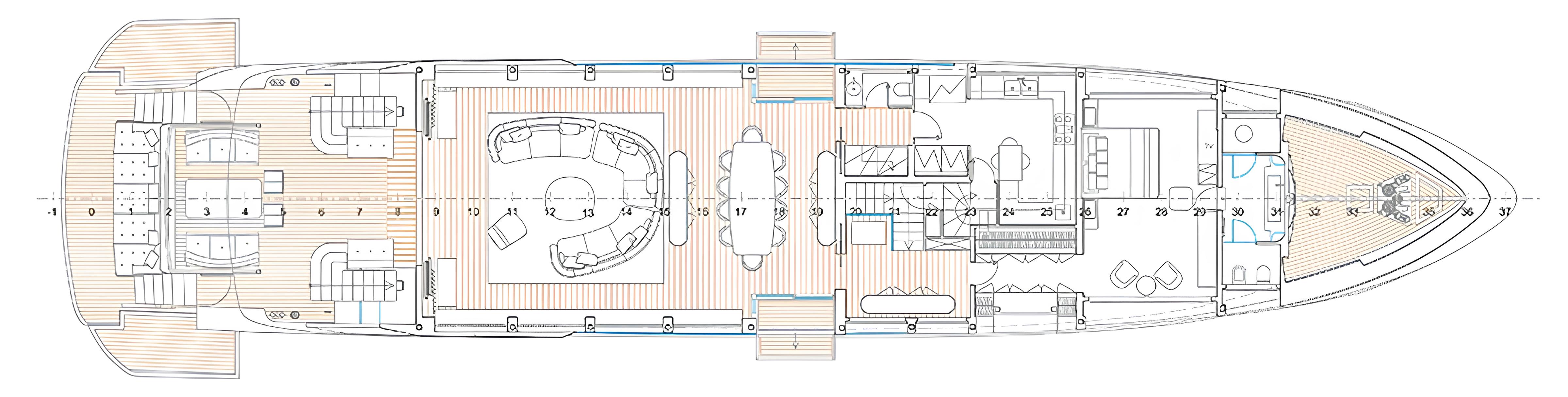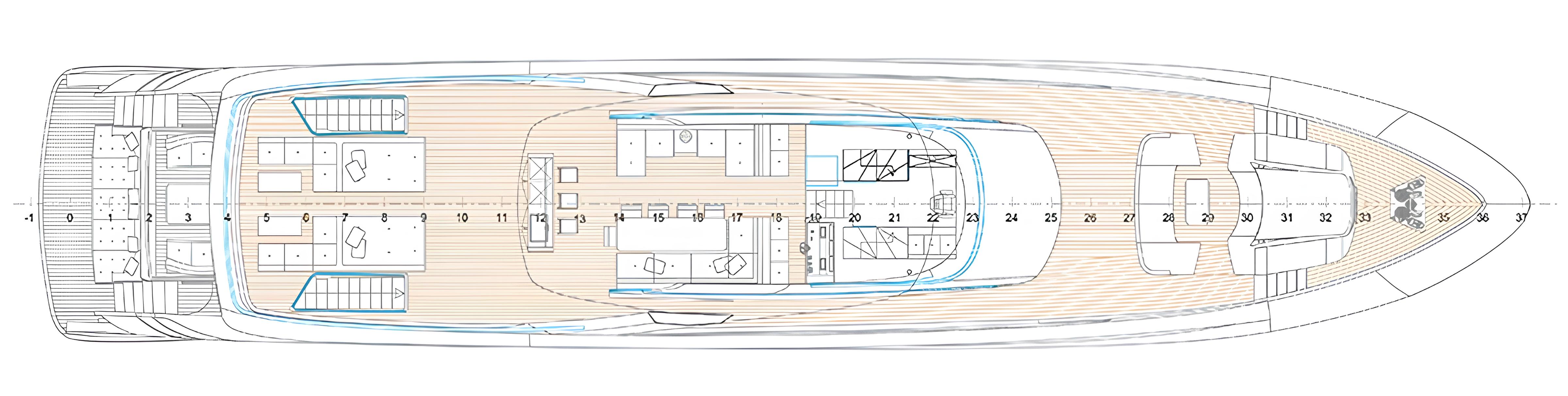 Интерьер Amer F126 сочетает изысканные материалы, такие как итальянская кожа и натуральное дерево, что придаёт пространству уникальную атмосферу. Особое внимание уделено плавному переходу между внутренними и внешними зонами. Главная и верхняя палубы открывают великолепные виды, а бичклаб с гидравлической платформой позволяет наслаждаться временем на воде в полной мере.
