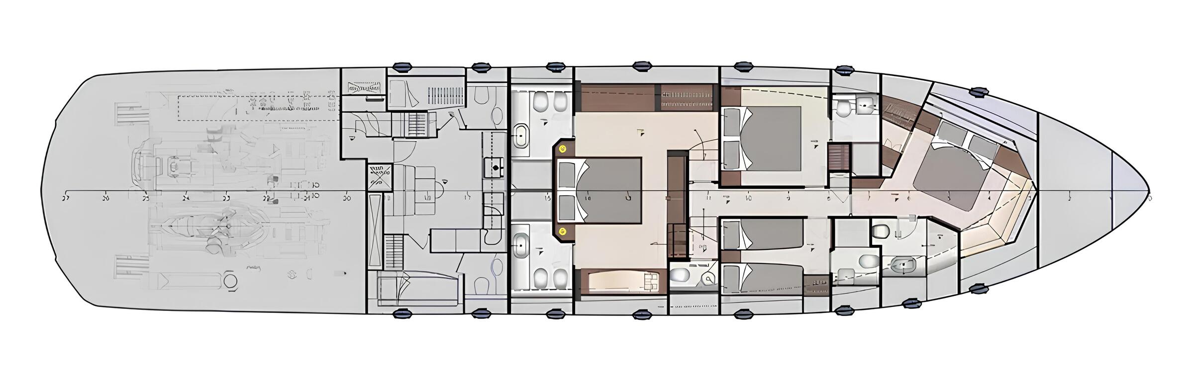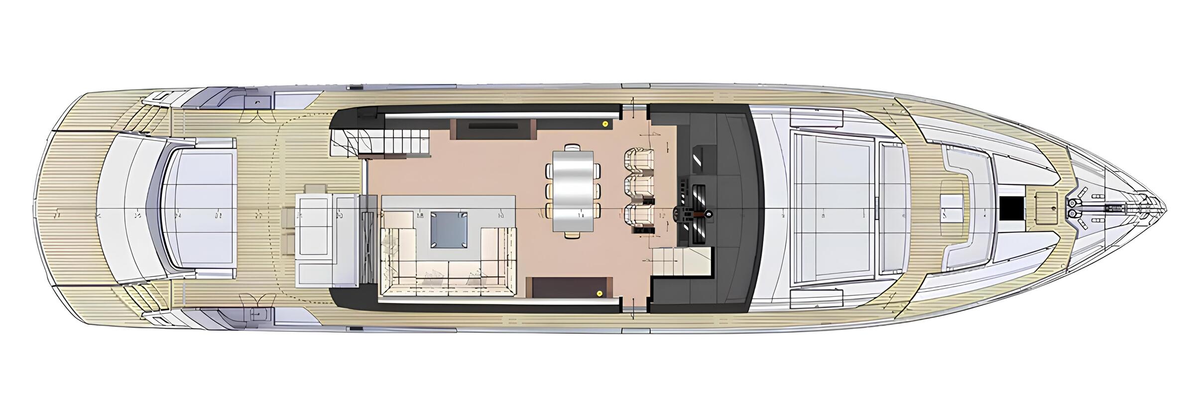 Два двигателя MTU 16V 2000 M96L по 2 638 л.с. позволяют развивать скорость свыше 40 узлов. Планировка включает просторный салон с современным постом управления, каюту владельца во всю ширину корпуса, 2 VIP-каюты и 1 гостевую каюту с дополнительным спальным местом. Через отдельный доступ можно попасть в зону экипажа, которая включает полностью оборудованный камбуз.