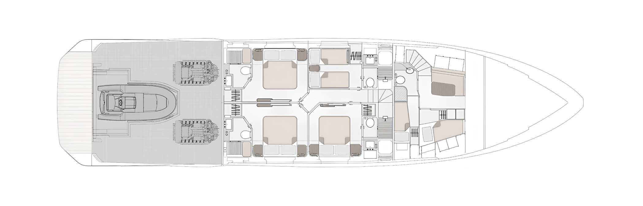 MARYBELLE может разместить до 10 гостей в 5 каютах, включая просторную мастер каюту на главной палубе с панорамными видами и 4 VIP-каюты на нижней палубе. Каждая каюта имеет отдельную ванную комнату для максимального уединения и комфорта. Просторная планировка, включая помещения для экипажа в носовой части яхты, обеспечивает отличную приватность для гостей и высокую эффективность работы экипажа.