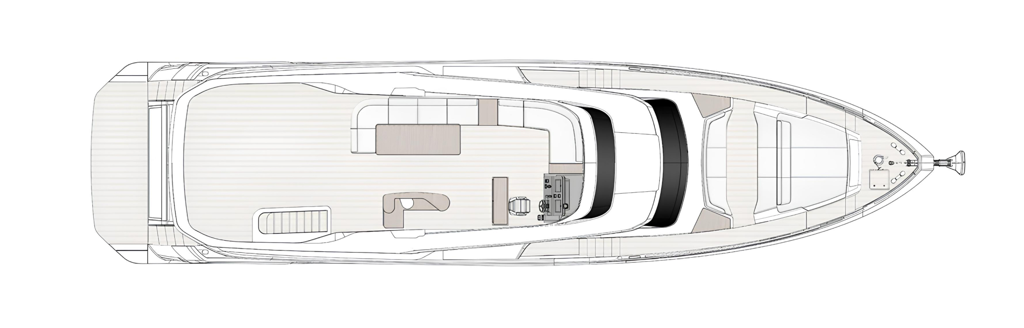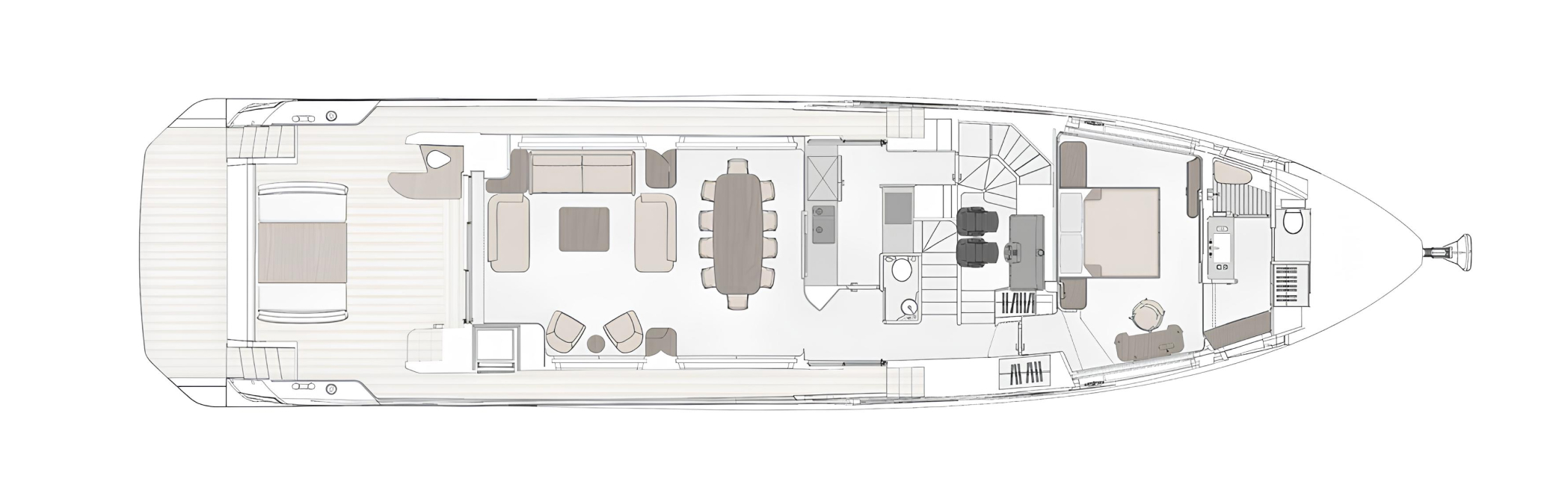 Главная палуба спроектирована для комфортного отдыха с плавным переходом между внутренними и внешними зонами. Кормовая палуба оснащена обеденной зоной и лаунжем на свежем воздухе. Флайбридж оснащён шезлонгами, большим обеденным столом и баром.
