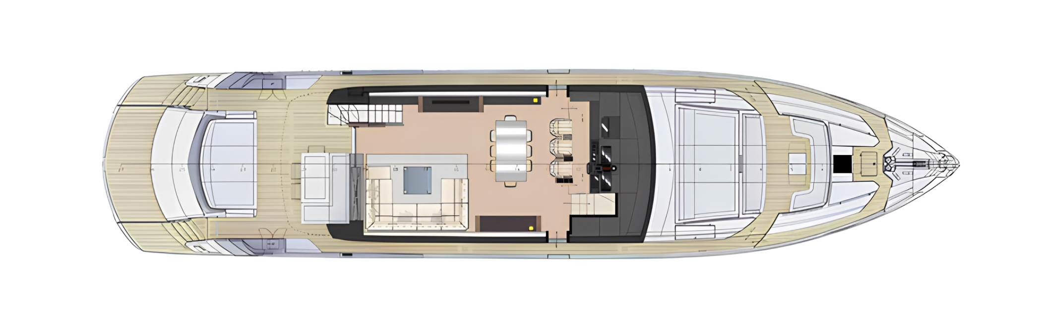 Открытые пространства организованы с учетом динамичного формата эксплуатации и включают зоны отдыха и управления, обеспечивая удобное перемещение по борту.