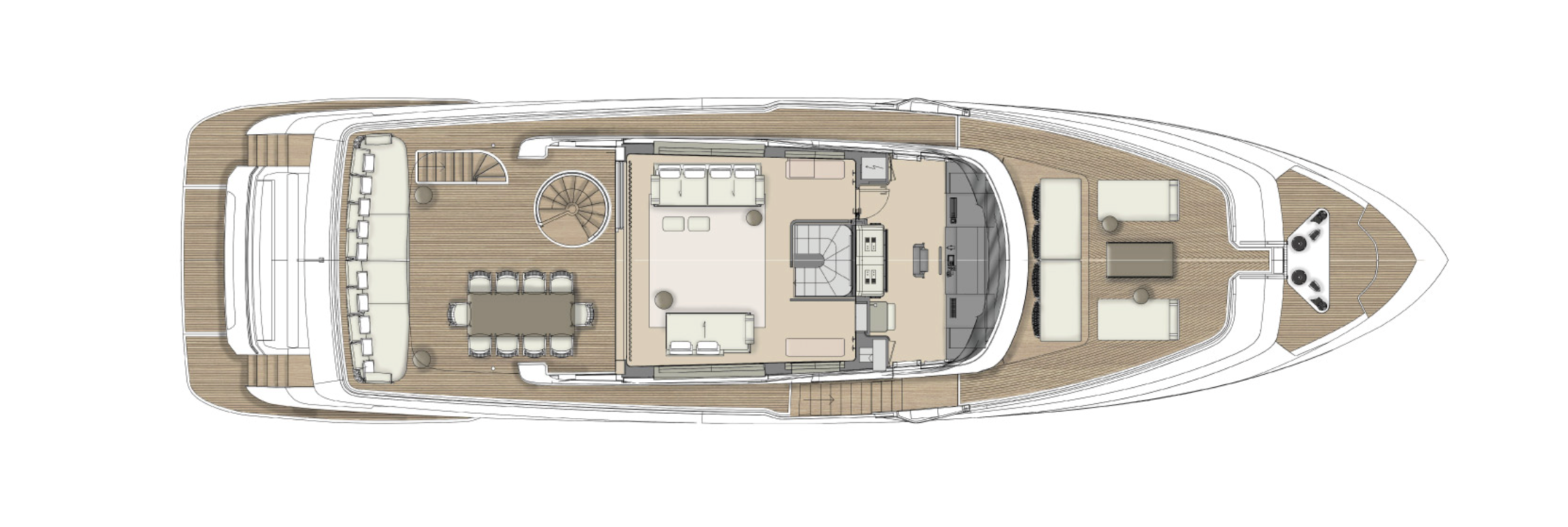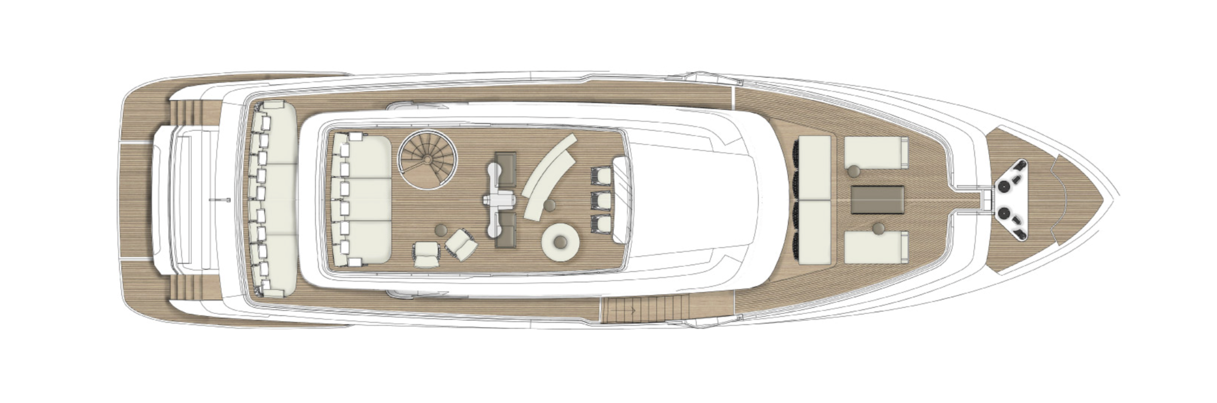 Главная палуба предлагает просторные зоны отдыха и плавный переход между внутренними и наружными зонами. Сандек с обеденной зоной и баром является отличным местом для отдыха с панорамными видами во время стоянки на якоре. Верхняя палуба предлагает большую обеденную зону, а в носовой части расположена большая зона для загорания.