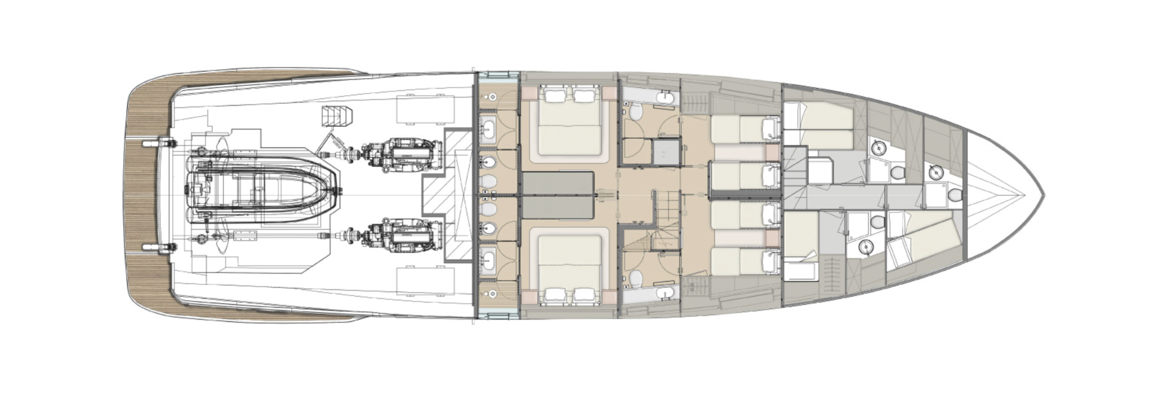 Планировка яхты предлагает размещение для 11 гостей в 5 каютах, включая мастер каюту на главной палубе, две VIP-каюты и две двухместные каюты, каждая из которых оснащена собственной ванной комнатой. Отдельные помещения для экипажа обеспечивают приватность для гостей, гарантируя высокий уровень обслуживания.