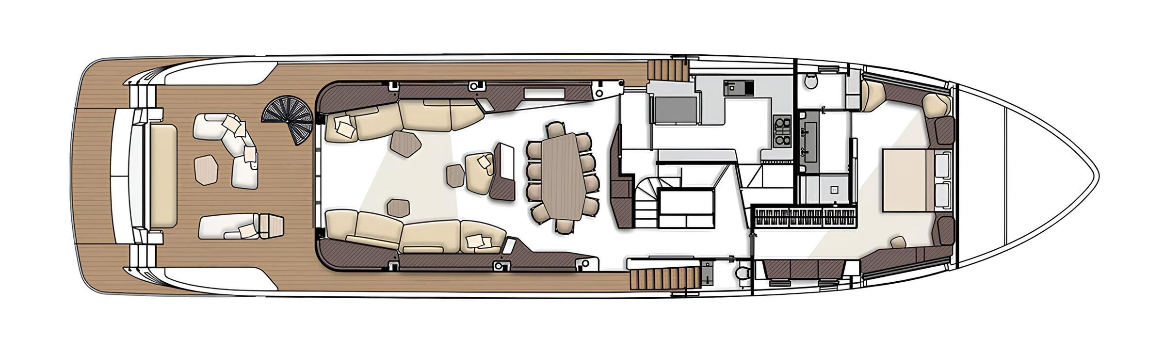 Внешние зоны отдыха PALMAX включают просторный лаунж на флайбридже, зону для загорания на носу и обеденную зону в кокпите. Гидравлическая плавательная платформа обеспечивает легкий доступ к воде и водным игрушкам.
