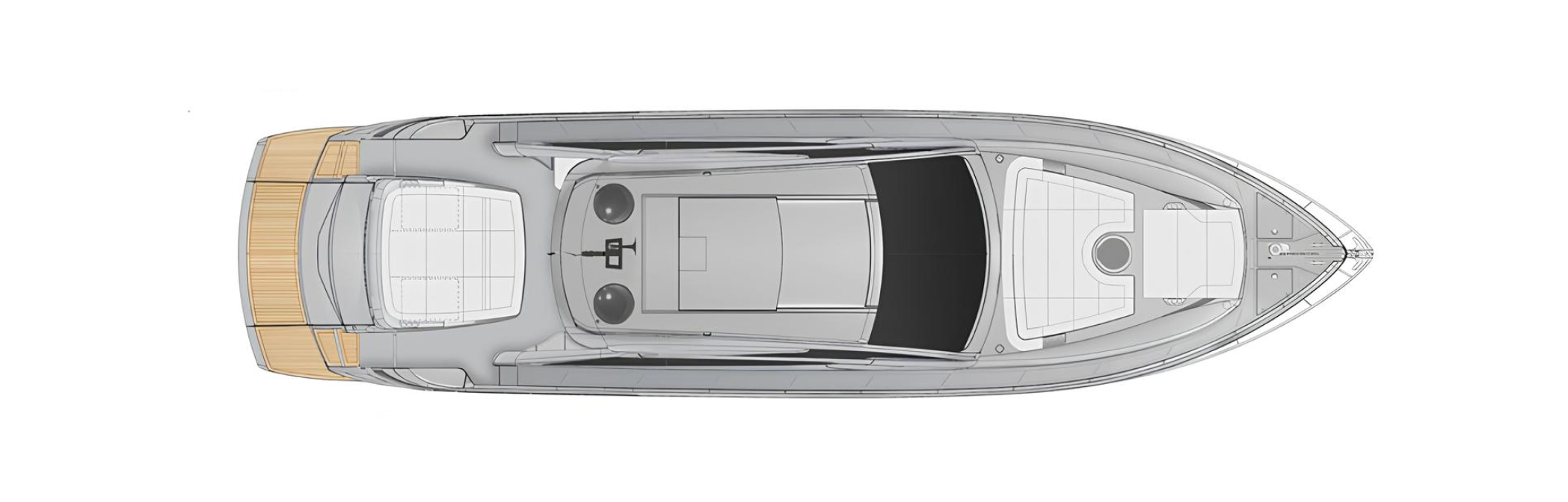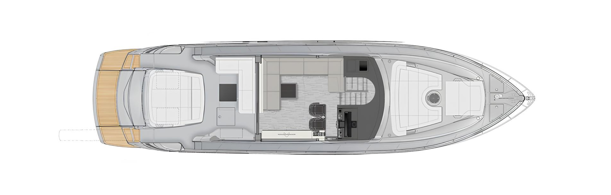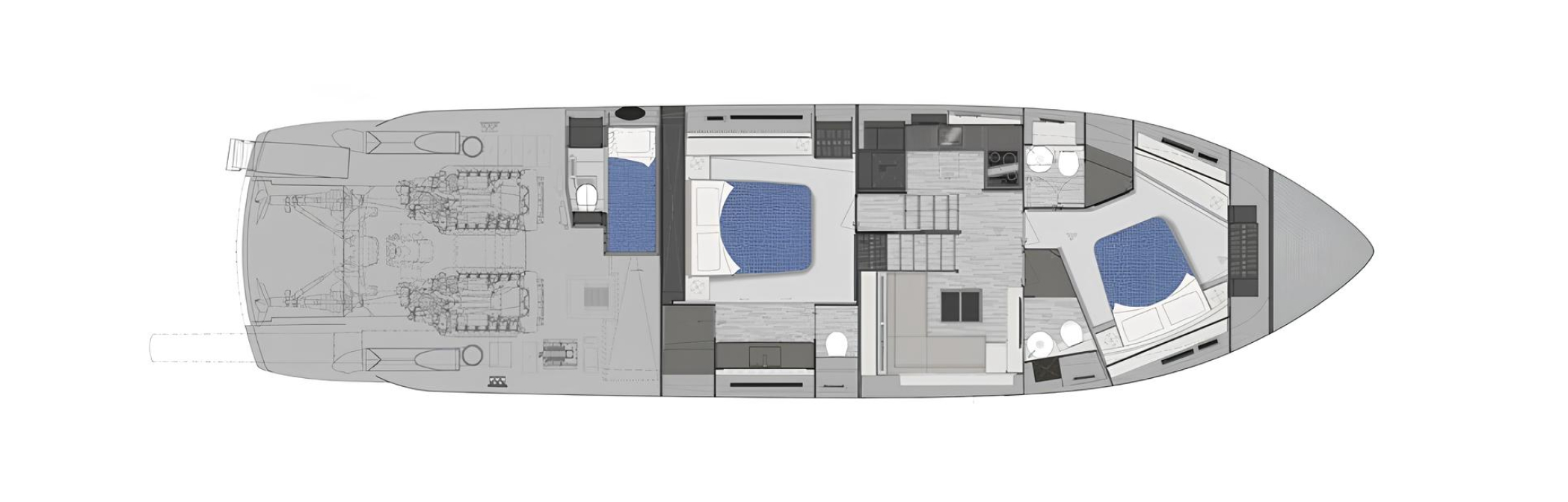 Планировка нижней палубы включает две каюты - мастер каюту на миделе и носовую VIP, обе с собственными санузлами. Салон на главной палубе трансформируется в дополнительную каюту, увеличивая общую вместимость до шести гостей. Отдельная каюта экипажа рассчитана на одного члена команды и обеспечивает автономность обслуживания.