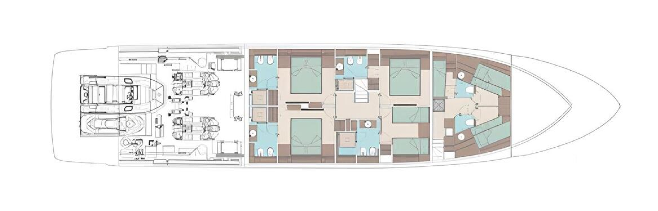 На главной палубе STILE DI VITA также находятся кухня, дневной санузел и центральная лестница. Мастер-каюта во всю ширину корпуса в носовой части включает гардеробную, двуспальную кровать, диван, туалетный столик и ванную комнату с двумя раковинами и душем. На нижней палубе четыре гостевые каюты вмещают до восьми гостей. Экипаж размещается в трёх отдельных каютах.