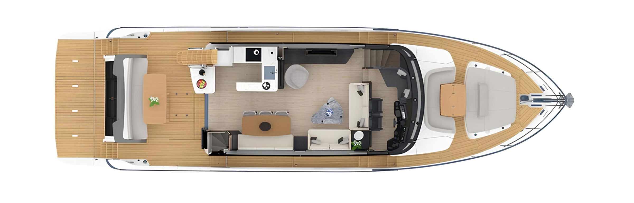 Главная палуба организована с акцентом на свет и пространство: панорамное остекление во всю высоту обеспечивает естественное освещение и визуальную связь с морем. Центральное расположение машинного отделения позволяет увеличить внутренние объемы и оптимизировать планировку. Пост управления выполнен в формате приподнятого открытого поста с изогнутым безрамным ветровым стеклом, обеспечивающим широкий обзор.