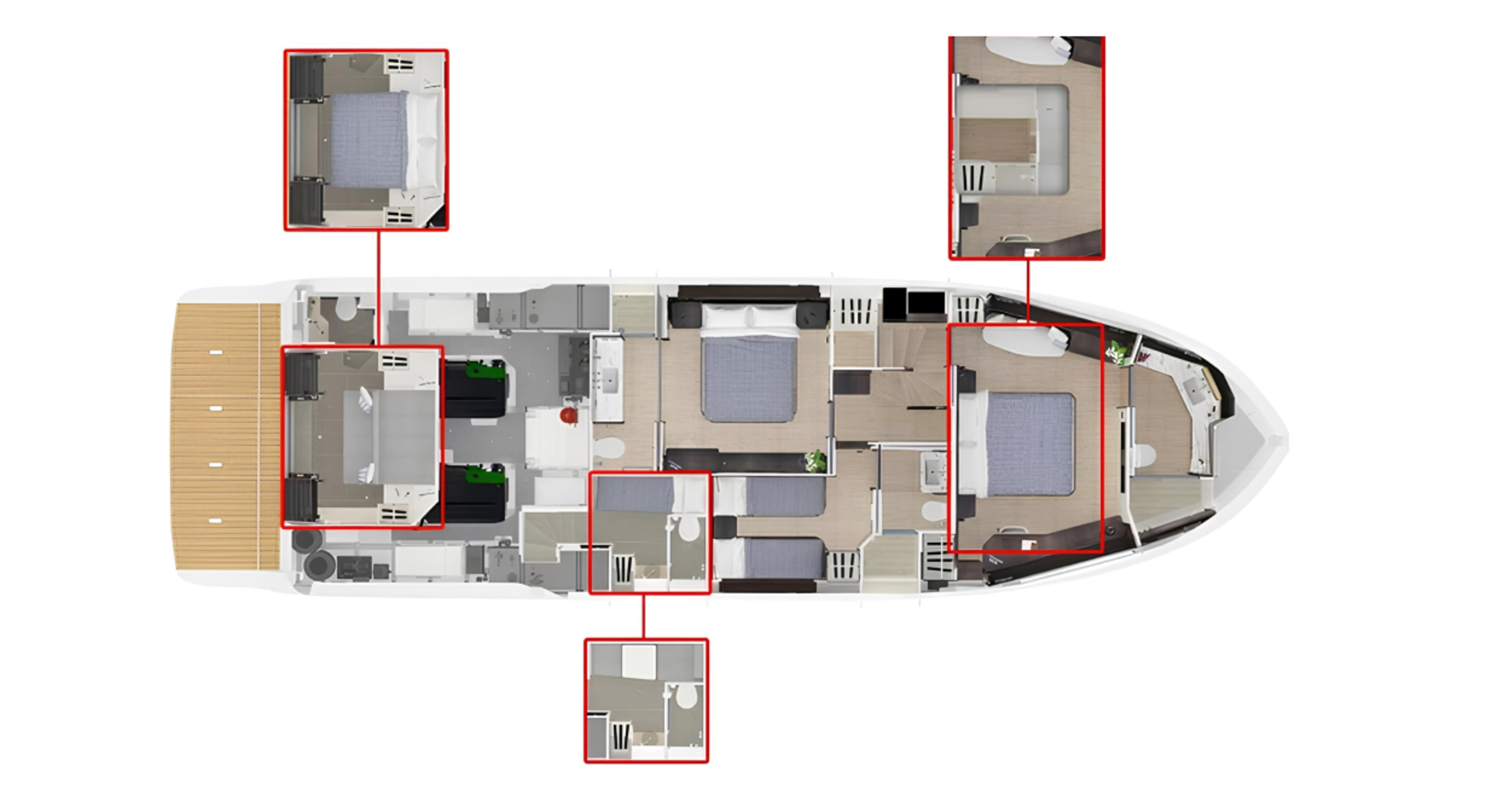 Планировка THE ONE предусматривает размещение до 8 гостей в четырех каютах. Особенностью яхты является трансформируемая кормовая зона beach club, которая при необходимости может быть преобразована в полноценную двухместную каюту с раздвижными дверьми и герметичным остеклением, расширяя функциональность пространства. Для экипажа предусмотрено отдельное размещение для одного человека.