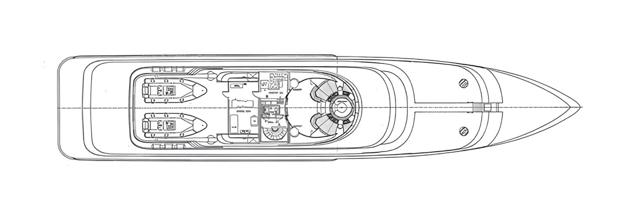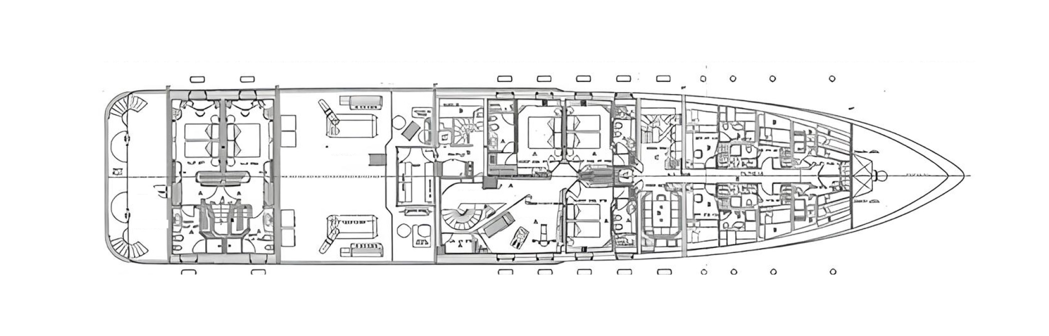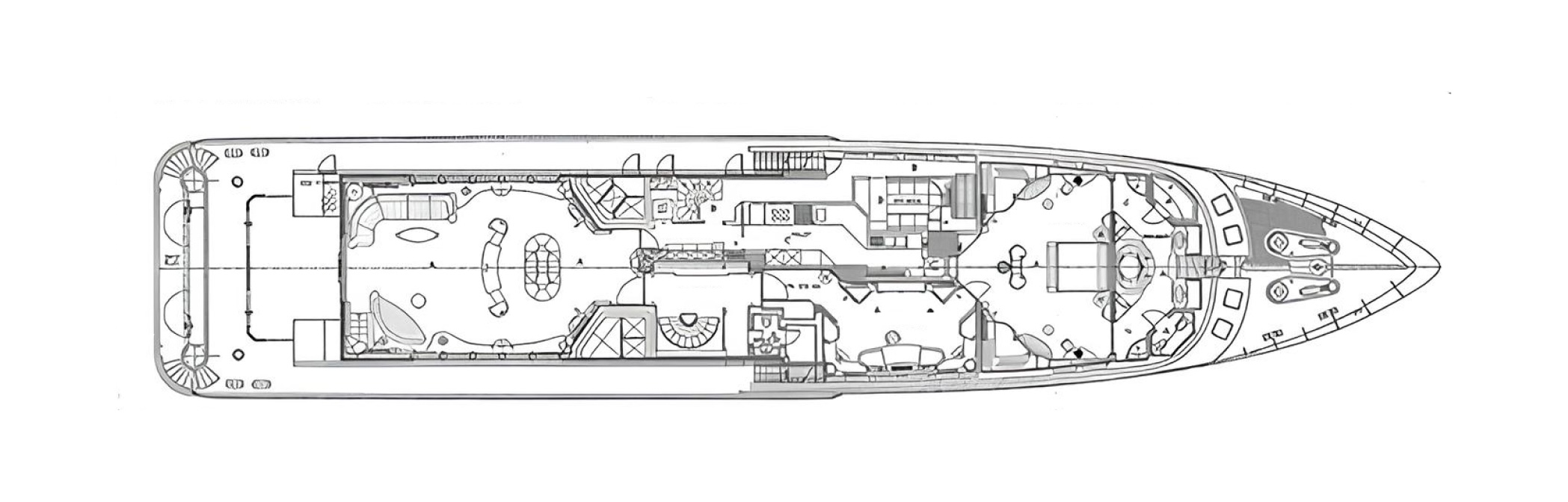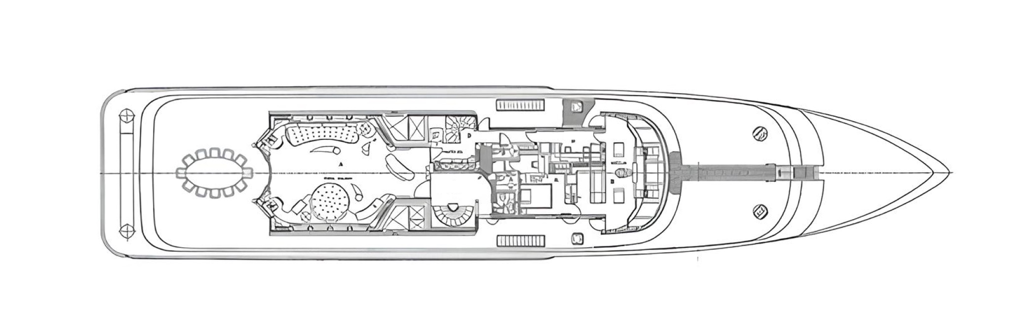 На открытых палубах расположены зоны для отдыха и обедов, сандек с джакузи и шезлонгами, а большие кормовые палубы подходят для длительных трапез и вечерних встреч. Стальной корпус и водоизмещение обеспечивают устойчивость в море. Два двигателя Caterpillar 3516 дают крейсерскую скорость 14 узлов и достаточную дальность для продолжительных маршрутов.