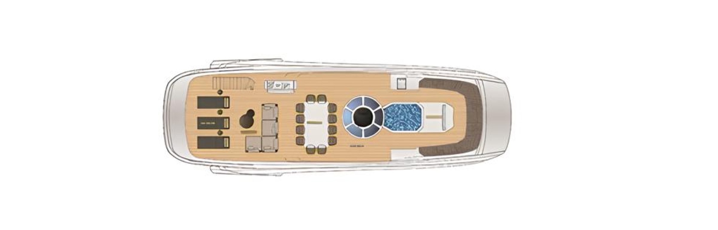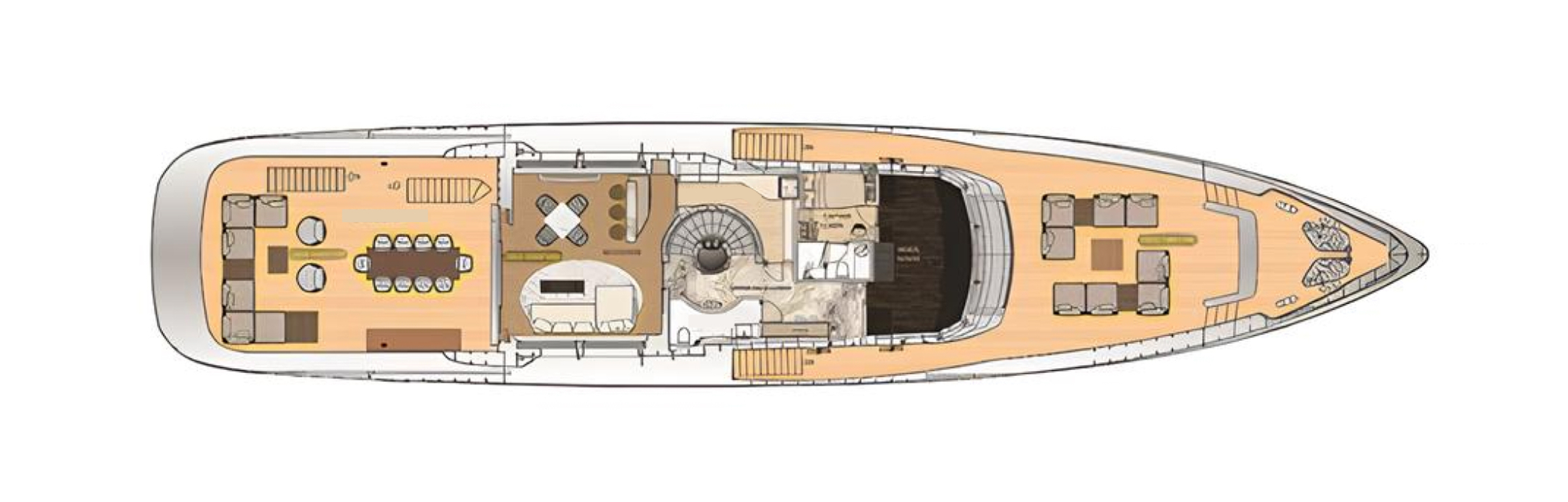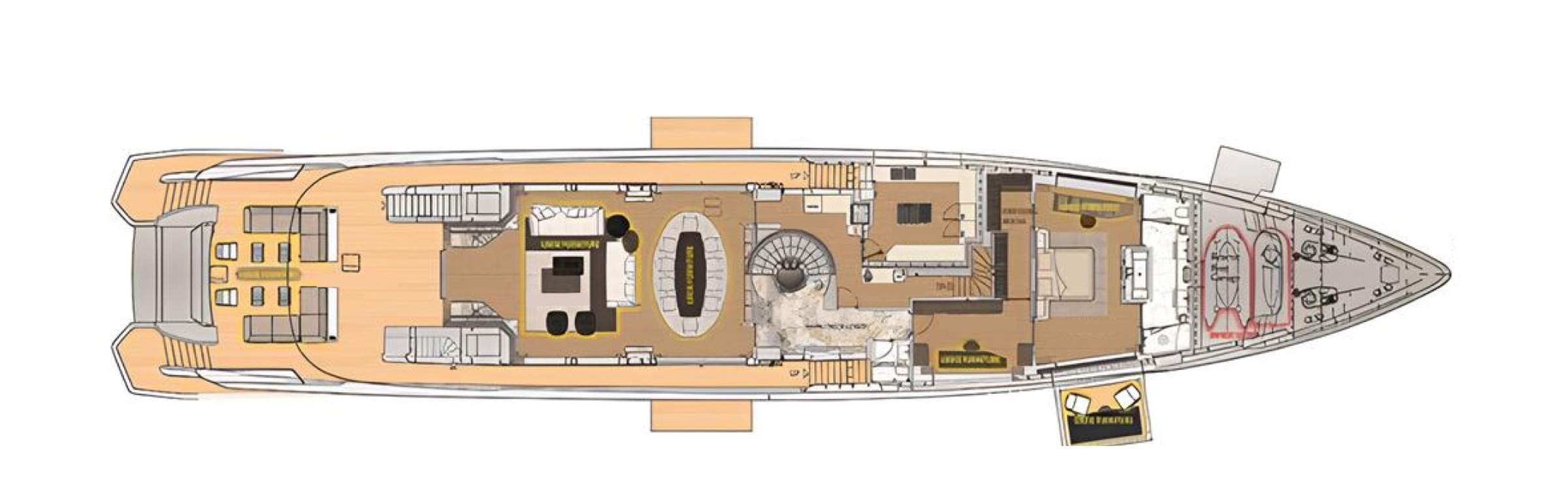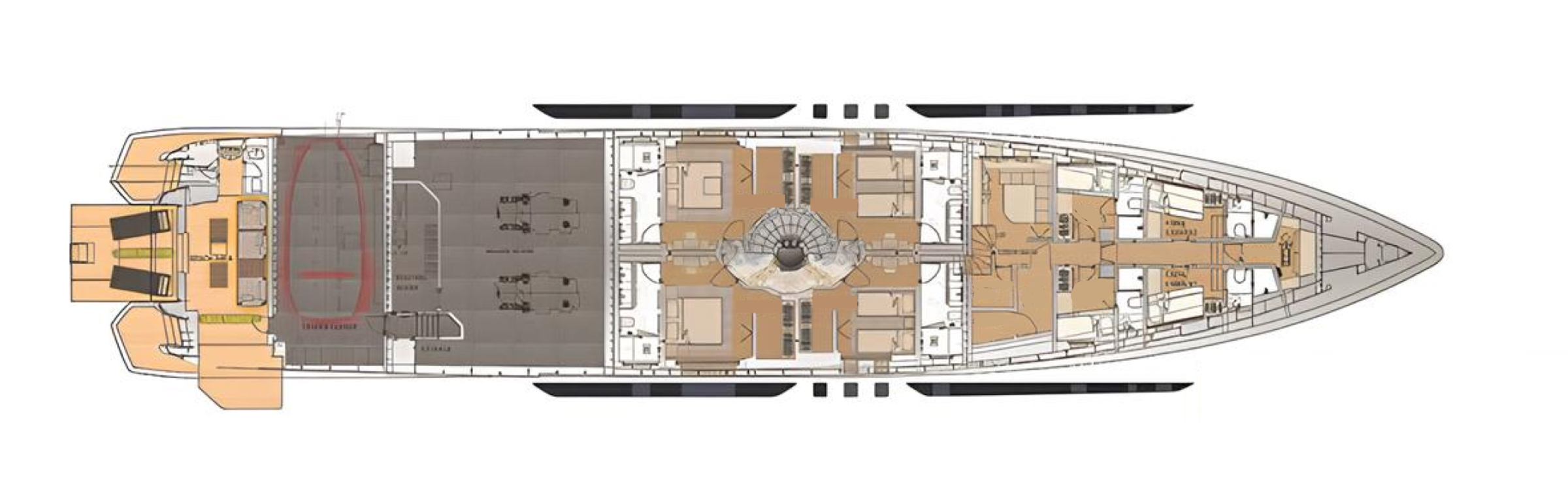 На борту предусмотрено размещение для 10-12 гостей в пяти каютах: каюта владельца на главной палубе с балконом и гардеробной, две VIP-каюты и две гостевые каюты на нижней палубе с возможностью установки дополнительных спальных мест, каждая с собственной ванной. Экипаж размещается в отдельных каютах для обеспечения приватности гостей и эффективного обслуживания.