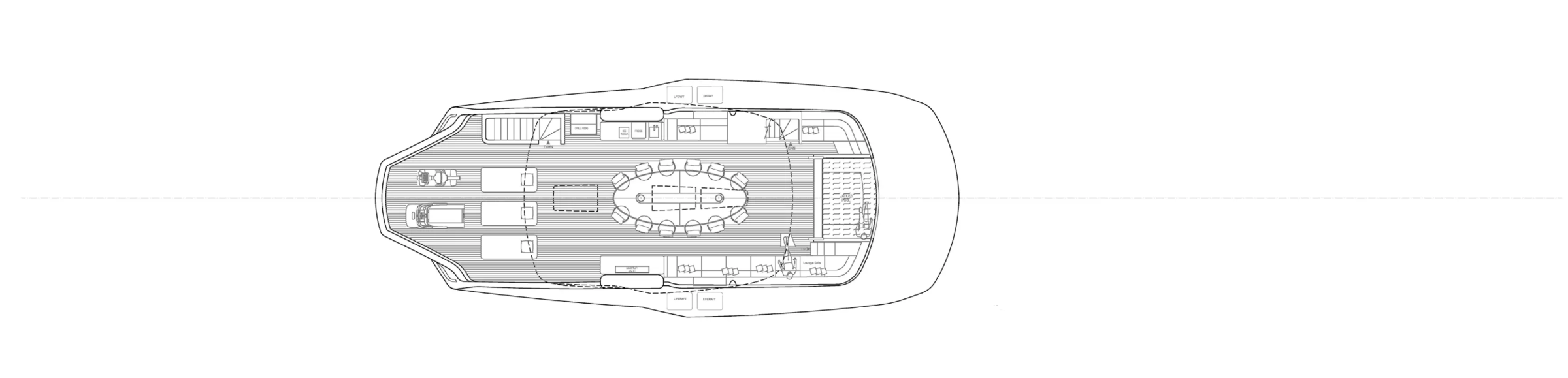 Пляжный клуб яхты включает откидные террасы с трех сторон, выходящие на воду, с панелями из тика, вешалками для полотенец и мягкими креслами - идеальное место для отдыха и водных развлечений.