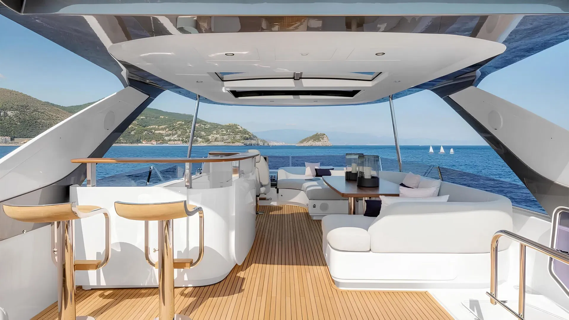Большой флайбридж с баром, шезлонгами и вторым постом управления