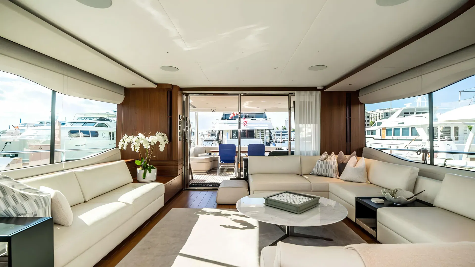 Салон на главной палубе представляет собой уютный лаунж с просторной гостиной в кормовой части с диванами вокруг журнального столика и широкоформатным телевизором, автоматически убирающимся в шкаф, формальной обеденной зоной с круглым обеденным столом и полностью оборудованным баром в носовой части.