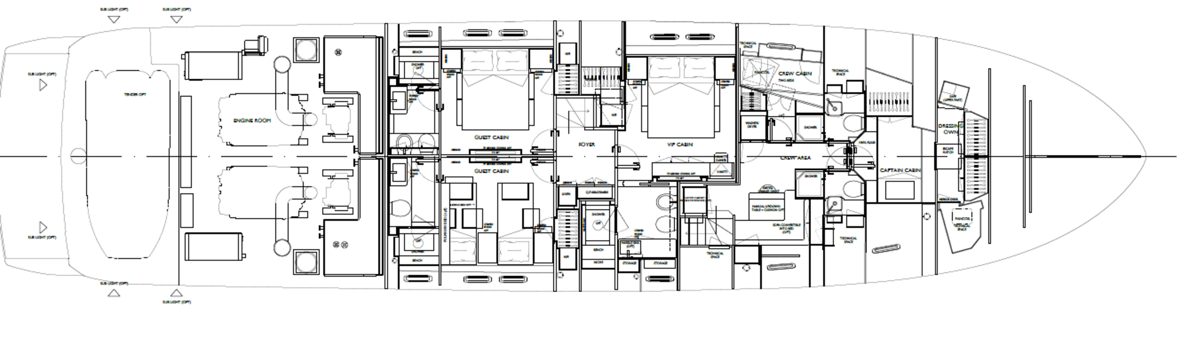 Sanlorenzo SUITU может разместить до 9 гостей в 4 каютах. Мастер каюта, расположенная на главной палубе, с отдельным выходом к носовой части яхты, обеспечивает удобство и простор, что обычно характерно для более крупных судов. Также предоставляется достаточно места для 4 членов экипажа, что гарантирует высокий уровень обслуживания и комфорта.