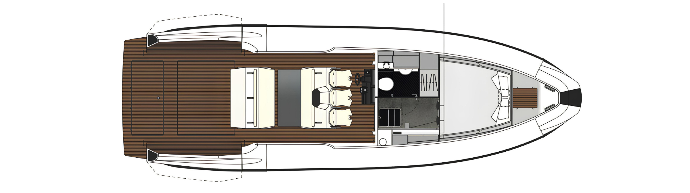 Deck spaces are designed for dynamic, day-oriented use. The foredeck features a sunbathing area, while the aft section is configured as a flexible lounge with adaptable seating. The cockpit follows an open-plan layout, allowing for multiple social configurations depending on use.