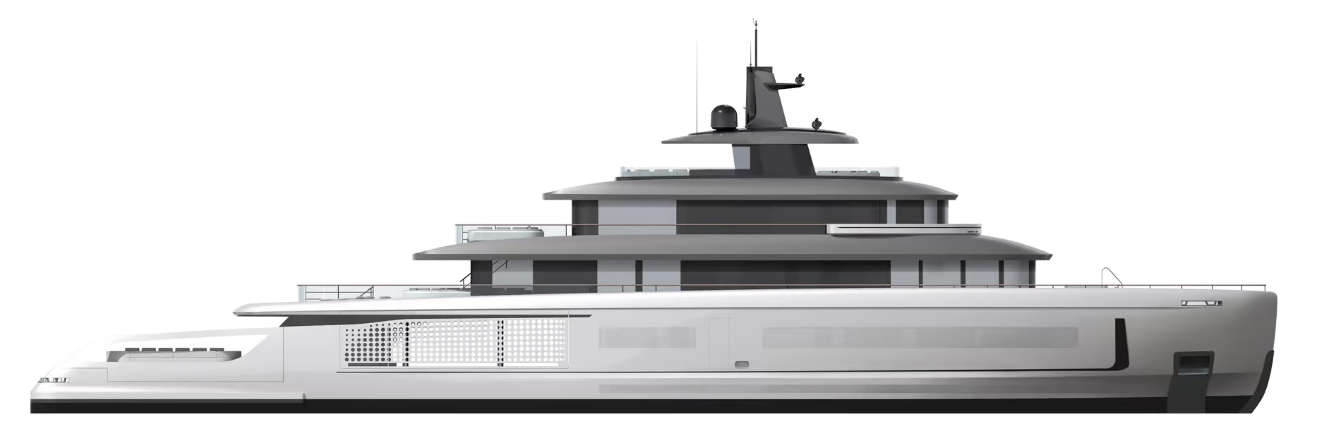 The Air concept maximizes versatility with an extended upper deck superstructure, serving as both a helipad and a panoramic relaxation area. Below, the main deck can be configured to accommodate an expedition room, gym, or additional lounge, while the aft section is optimized for carrying a wide range of water toys, including submarines, helicopters, and tenders.
