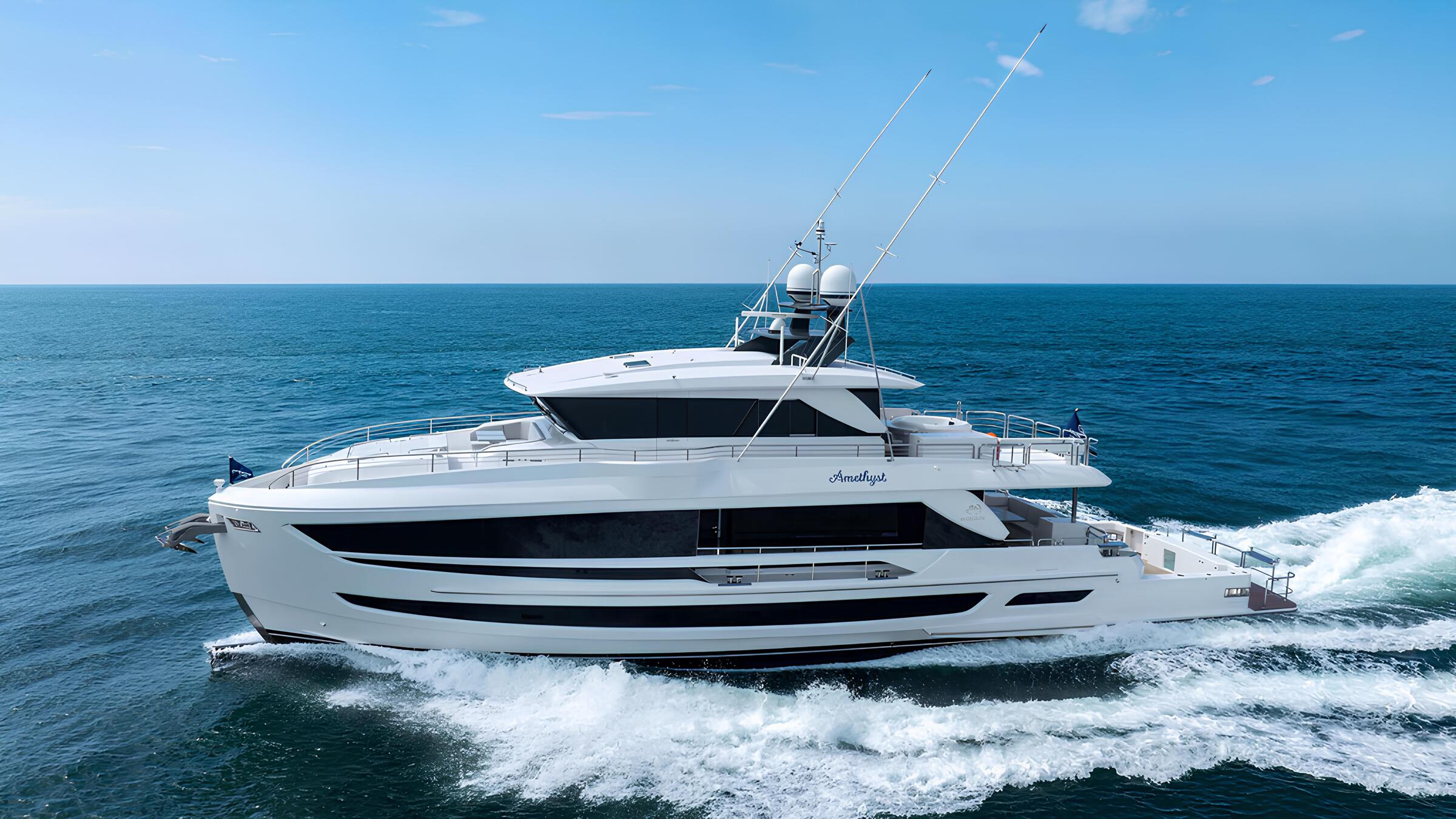 Powered by twin Caterpillar C18A engines, each delivering 1,136 horsepower, the FD80 combines impressive performance with exceptional stability. Two Onan 27 kW generators ensure reliable onboard power. With a beam of 6.87 meters and a draft of 1.70 meters, this yacht strikes the perfect balance between volume and maneuverability. Combining the comforts of a megayacht with the efficiency and functionality of a smaller vessel, the Horizon FD80 represents the pinnacle of modern yachting.