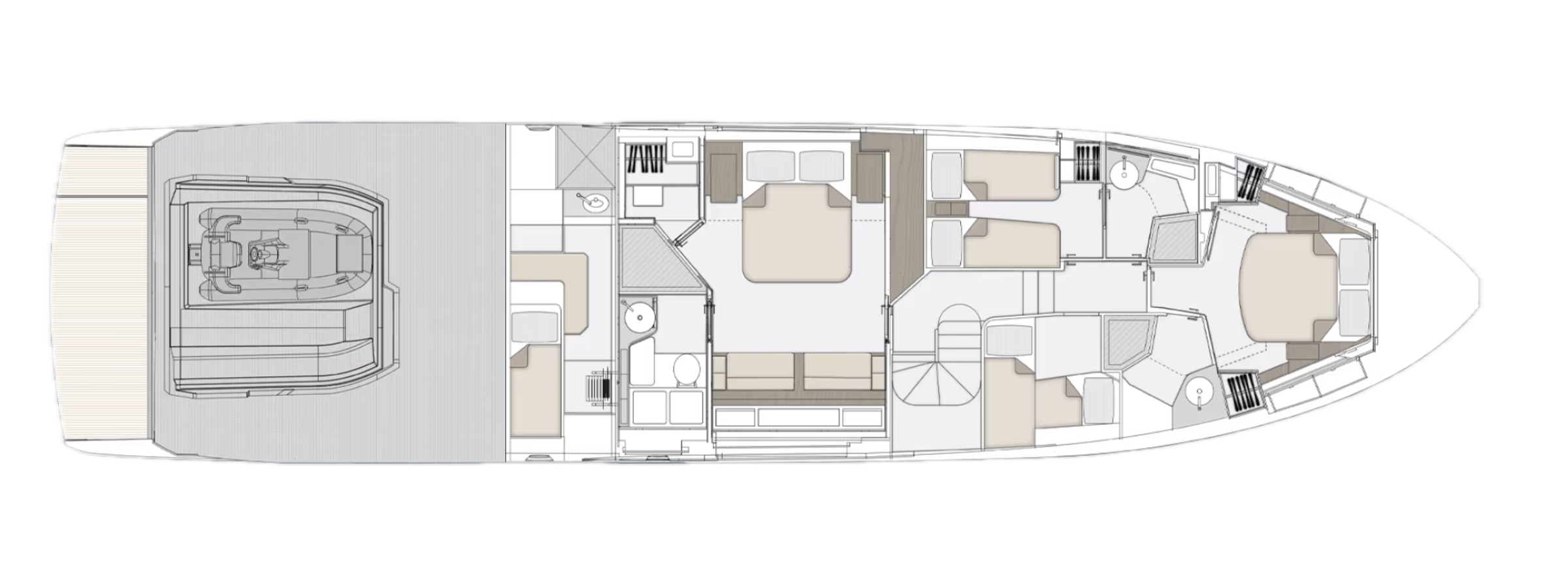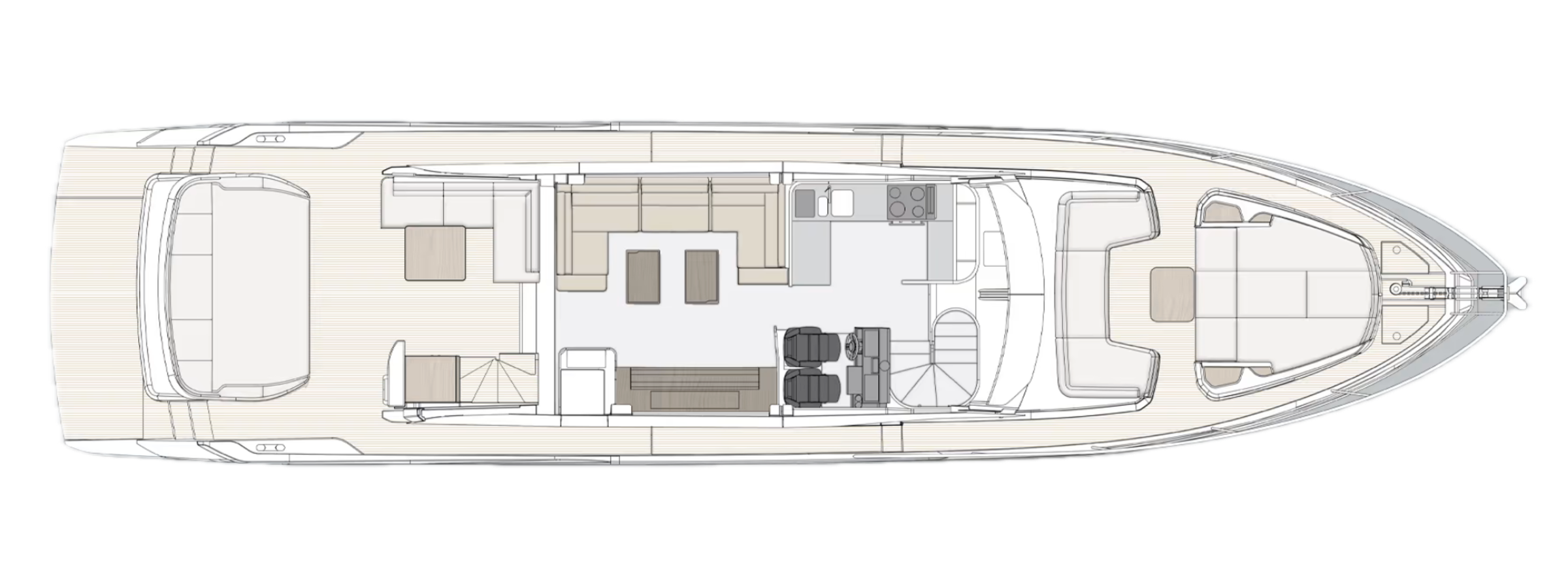 Accommodation is arranged for up to eight guests, including a master cabin with a walk-in wardrobe. The main deck is conceived as an open-plan living space, where the saloon and cockpit are visually and functionally connected. An optional sportfly adds an upper helm station and an additional outdoor relaxation area with a dining table, further enhancing the yacht’s versatility.