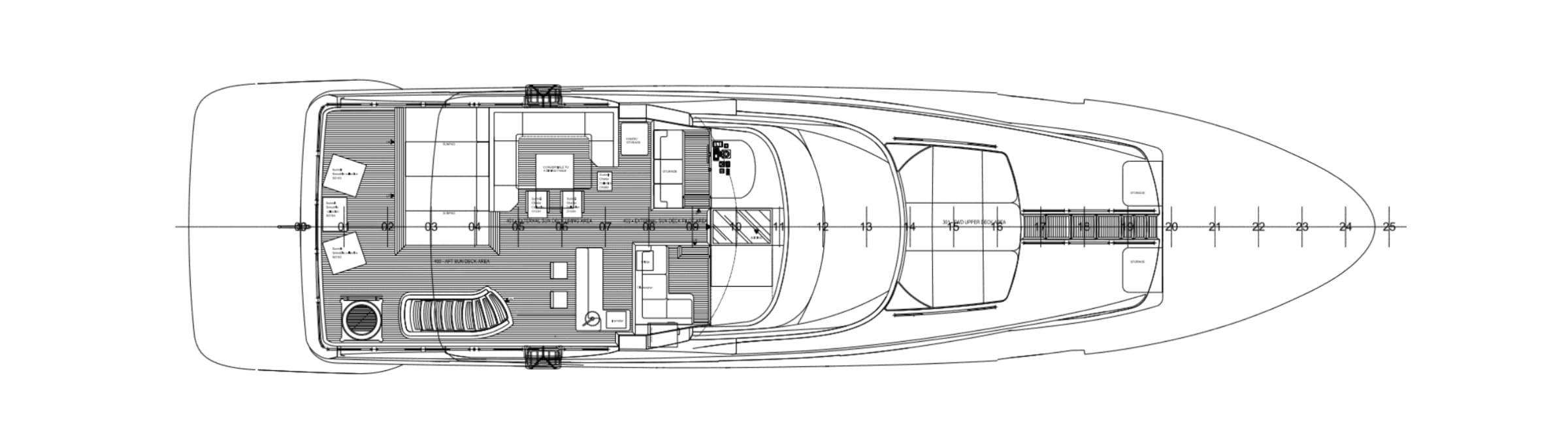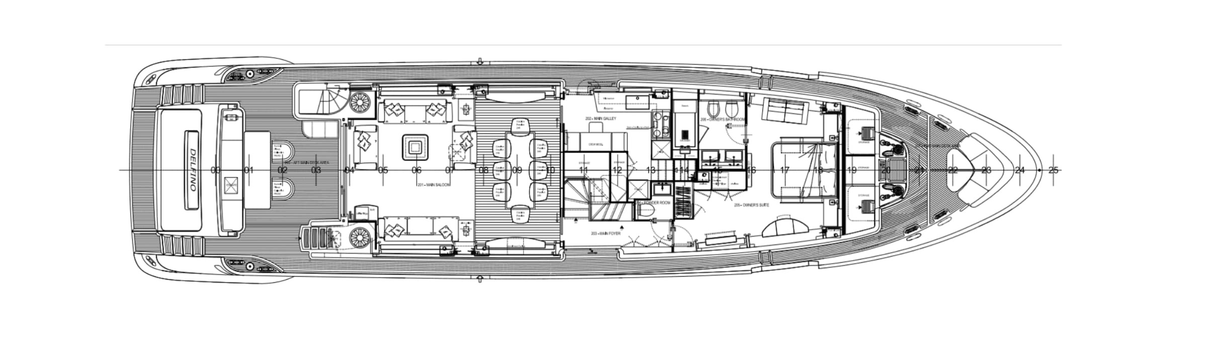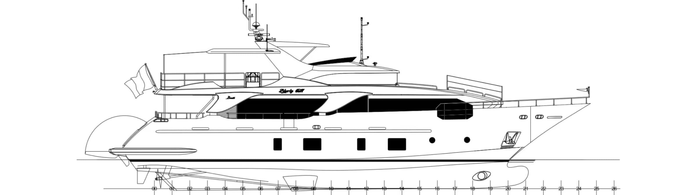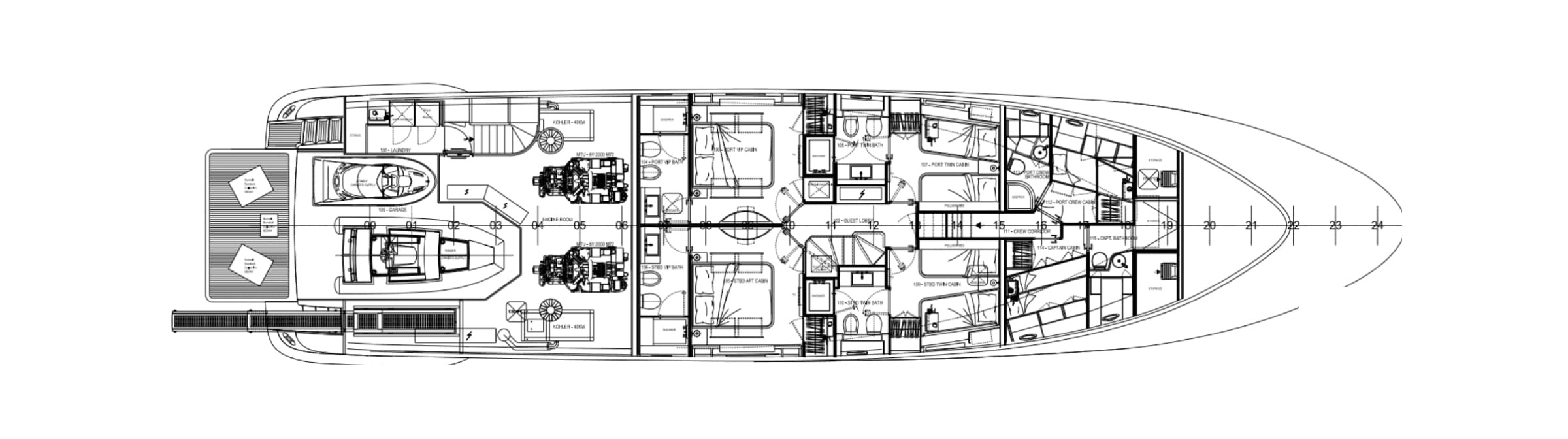 The layout accommodates up to nine guests across five cabins, each with en-suite facilities. The master suite is located forward on the main deck. The lower deck features two VIP cabins, a twin cabin, and an additional flexible cabin that can be used either as an office or a full guest cabin. Crew quarters consist of three cabins for up to five crew members, including a dedicated captain’s cabin.