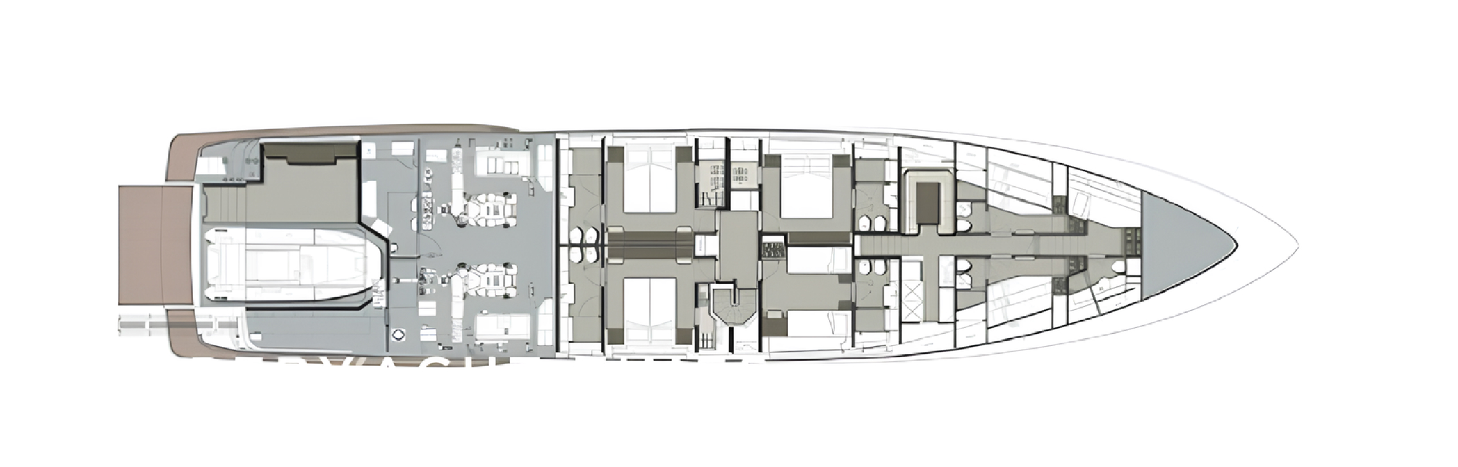 The yacht accommodates up to 11 guests across five well-appointed staterooms, supported by seven bathrooms. Crew quarters for seven are arranged across five cabins, including a dedicated captain’s cabin, ensuring a clear separation between guest and crew areas.