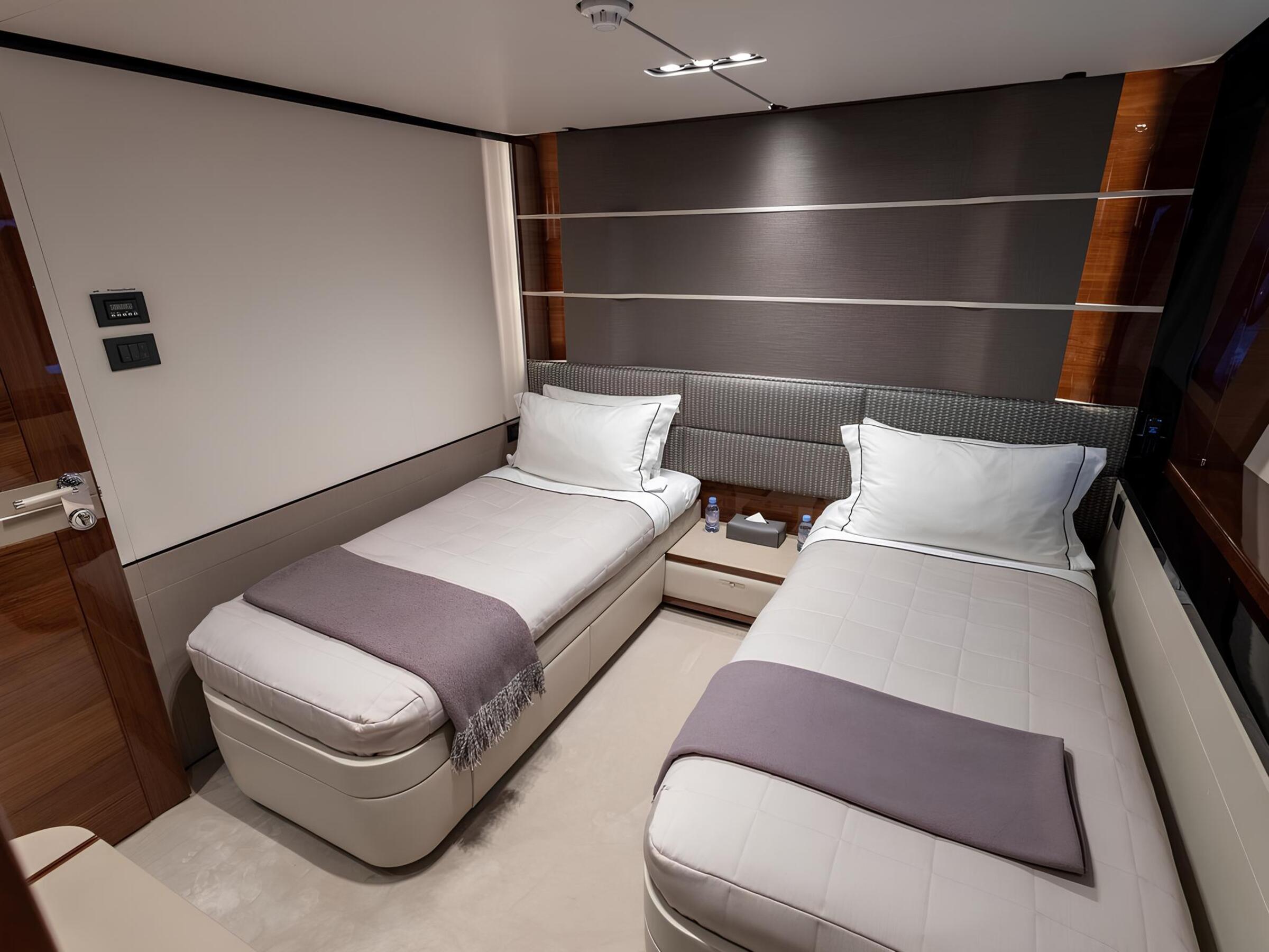 Master cabin on the main deck plus four guest cabins on the lower deck