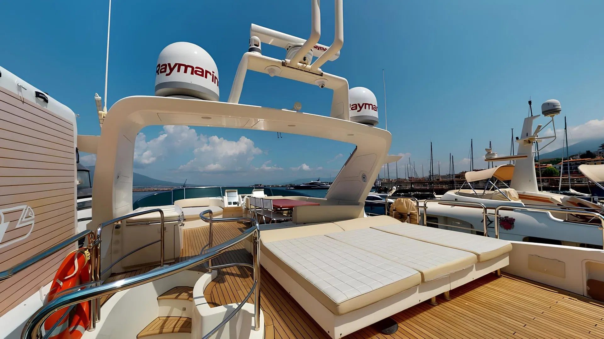 Hardtop flybridge with sunbeds, dining table and a secondary helm station, providing an additional level of privacy