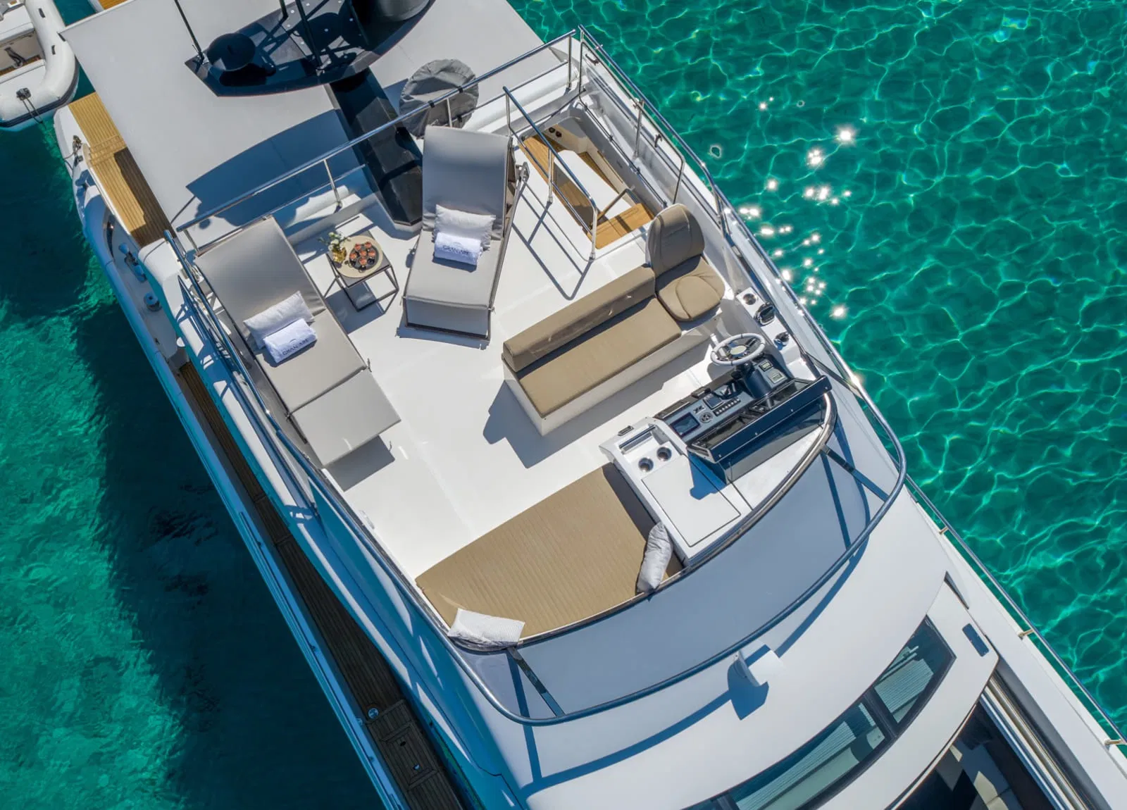 Flybridge with sunbeds, dining table and a secondary helm station