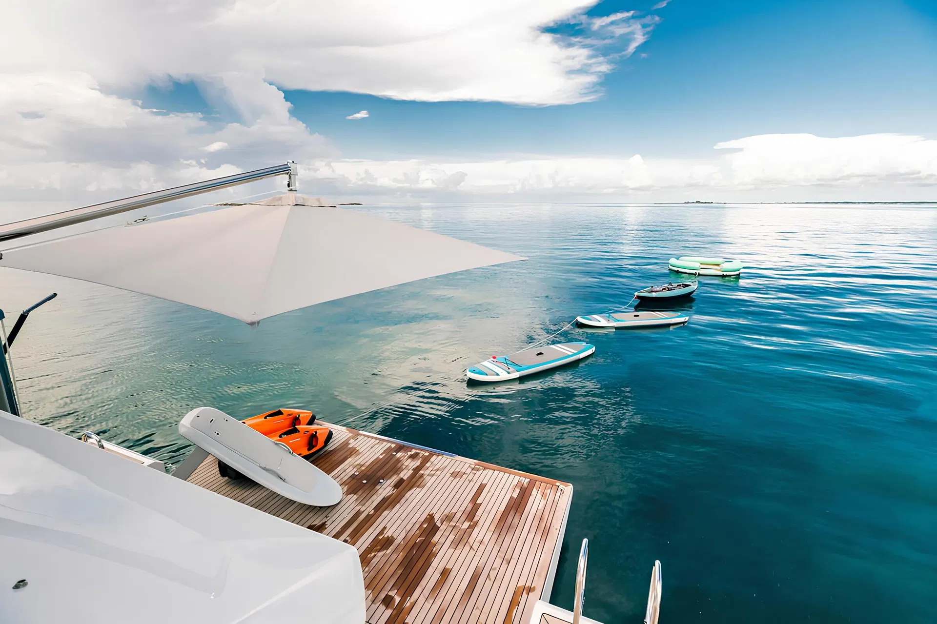 Garage with tender and extensive water toys including jet ski, Seabob, eFoil, paddleboards and inflatable platform