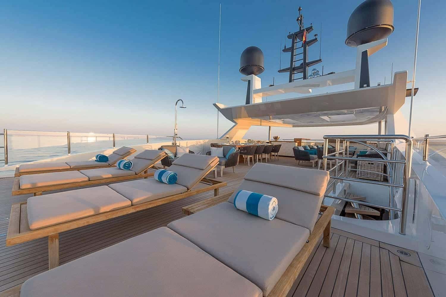Expansive sundeck with bar, dining area and relaxation spaces - the yacht’s primary outdoor living area