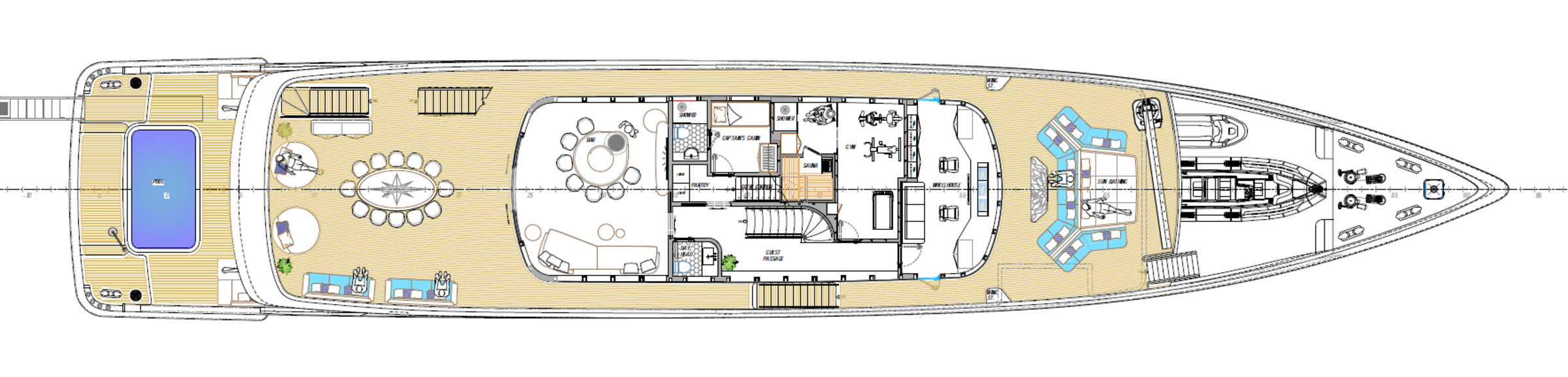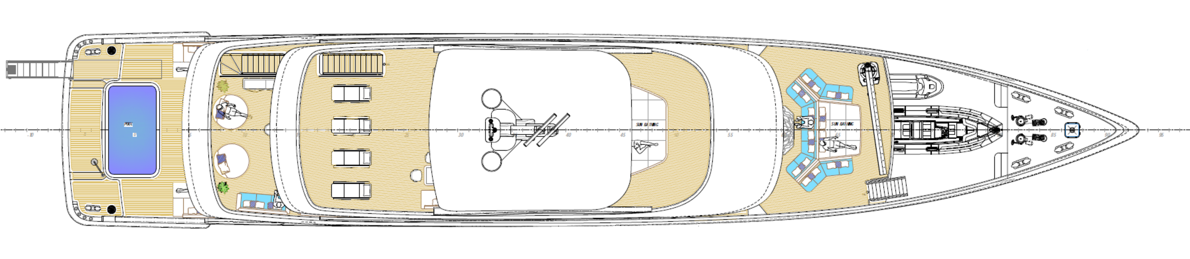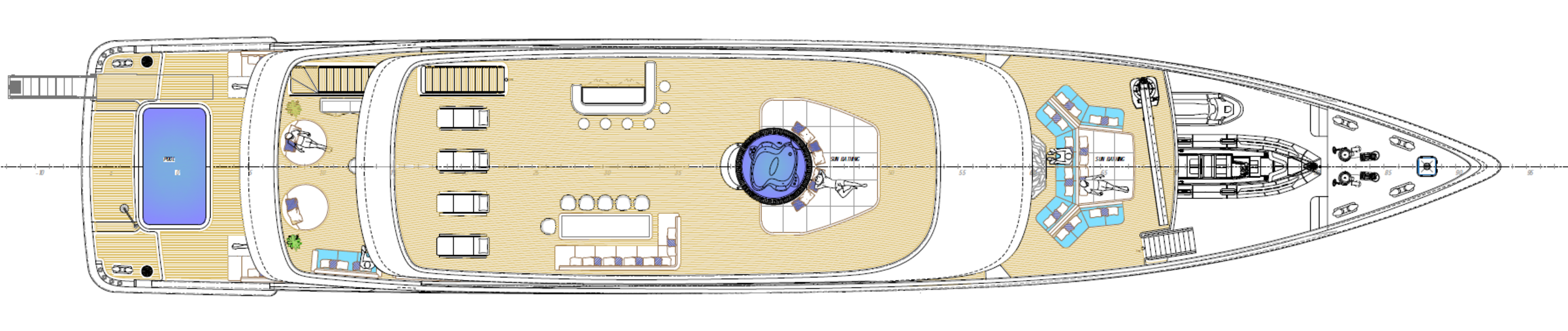 The aft section is configured as a beach club with direct water access and an integrated swimming pool measuring approximately 4.2 × 2.2 metres. The upper deck features an al fresco dining area, lounge, and bar, while the foredeck provides additional relaxation spaces. The sundeck includes a Jacuzzi, sunbathing areas, and a retractable screen for open-air cinema experiences.