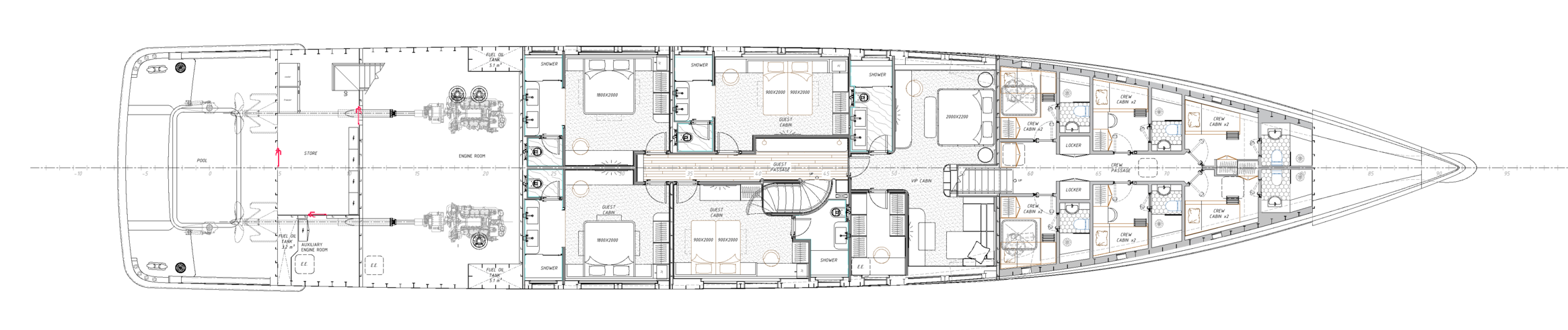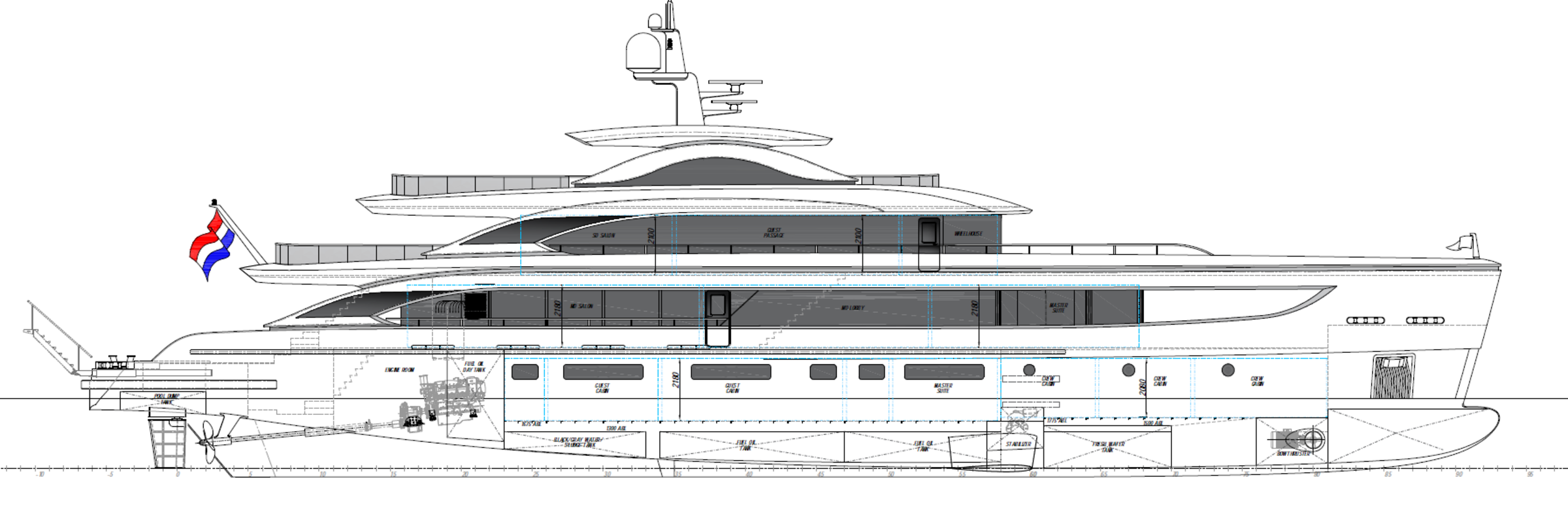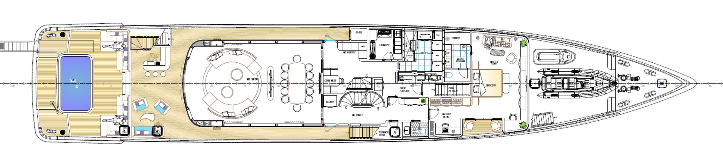 The main deck is designed with an open-plan layout, where the saloon and dining area form a unified space with panoramic glazing, ensuring abundant natural light and uninterrupted sea views. Guest and crew circulation are carefully separated, allowing for discreet and efficient service.