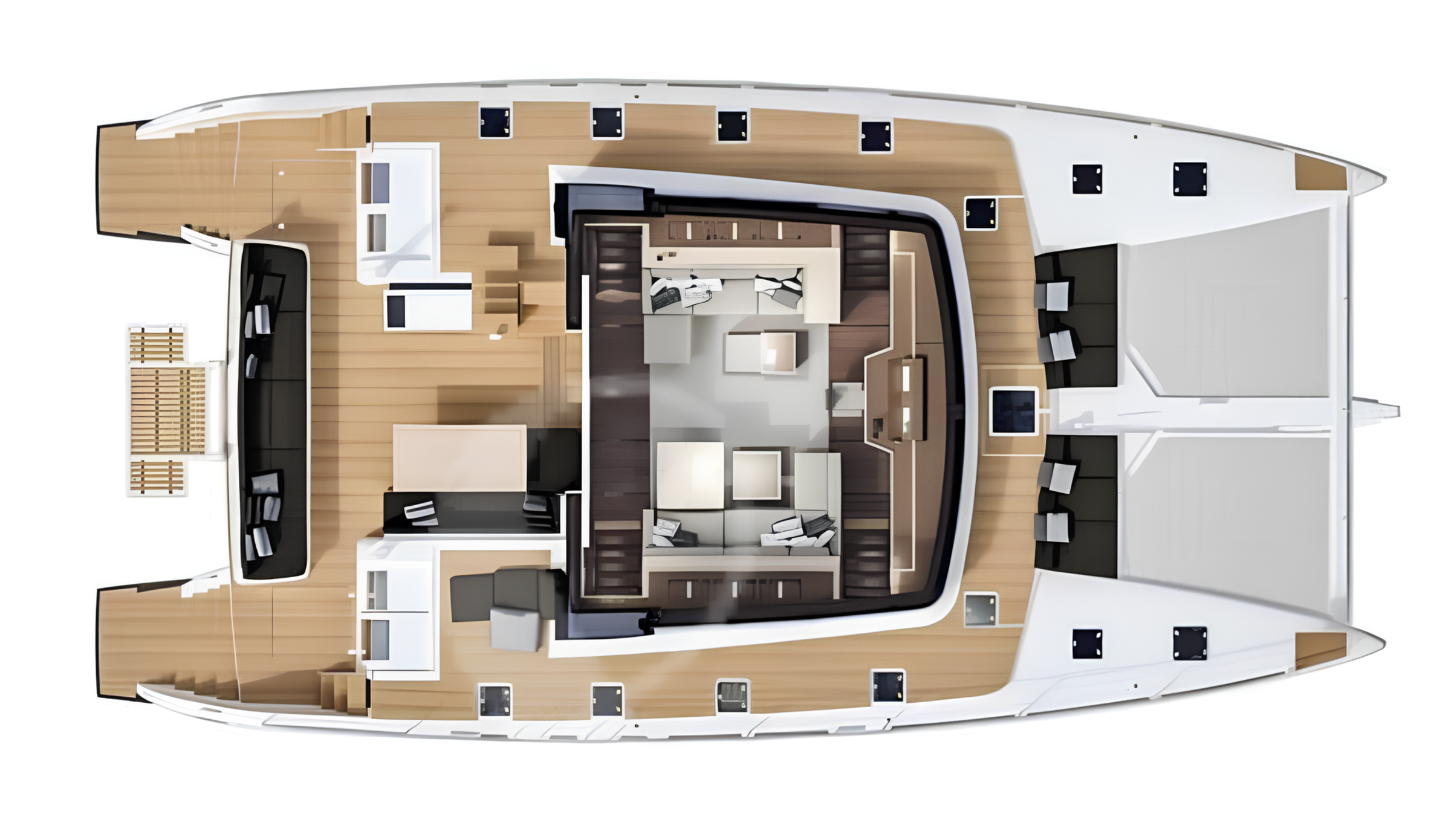 With a beam of approximately 10 metres, SEEK offers significantly greater interior and exterior volume than monohull yachts of similar length. Her layout is built around an open-plan concept, seamlessly connecting the saloon with exterior areas and maintaining continuous visual contact with the sea. The expansive flybridge - one of the largest in her class - serves as the primary relaxation space, complemented by both aft and foredeck lounging areas.