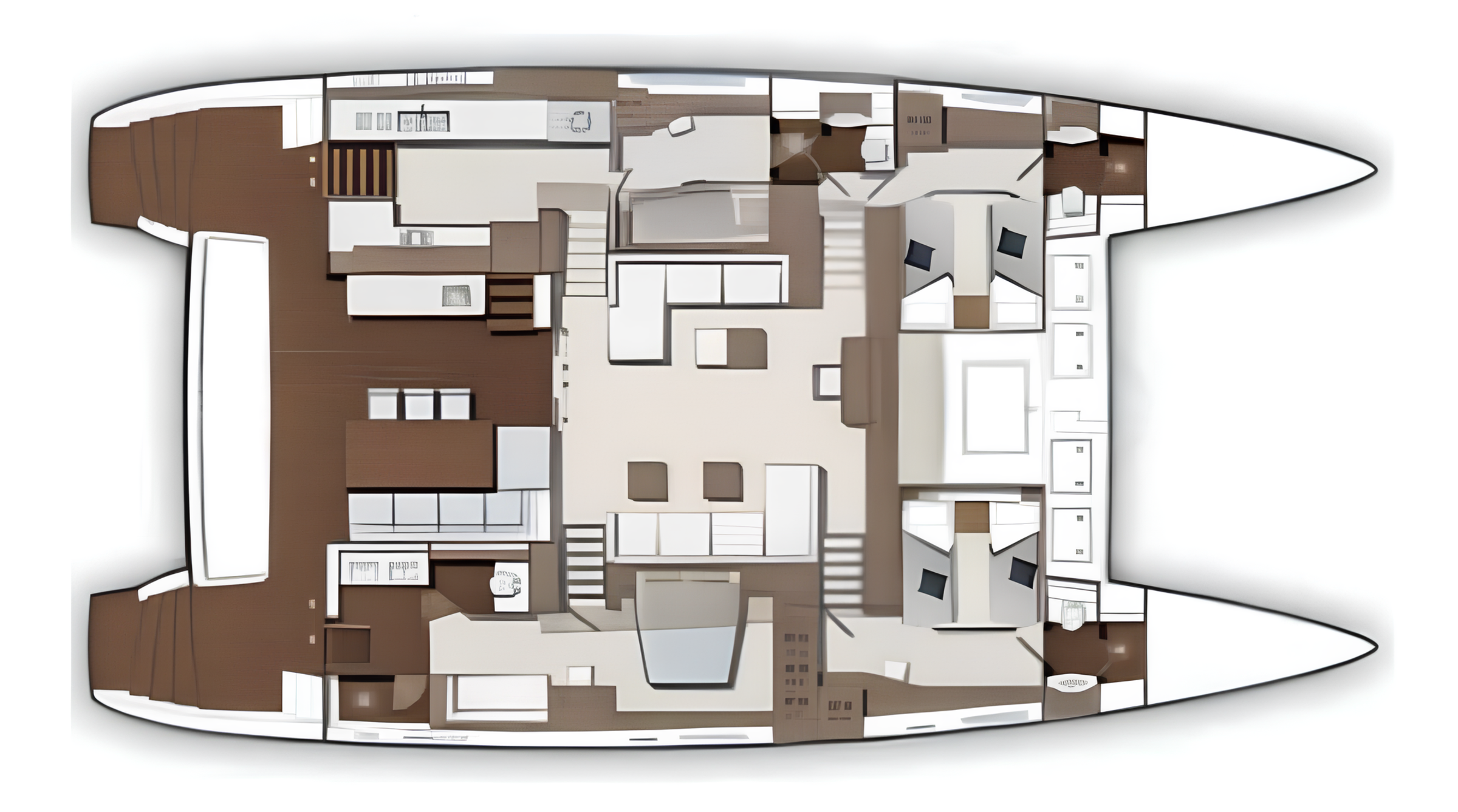 Accommodation is arranged for up to 9 guests across four en-suite staterooms. The configuration includes a master cabin, a twin cabin with an additional Pullman berth, a convertible twin/double cabin, and a bunk cabin - providing flexibility for a variety of guest groups.