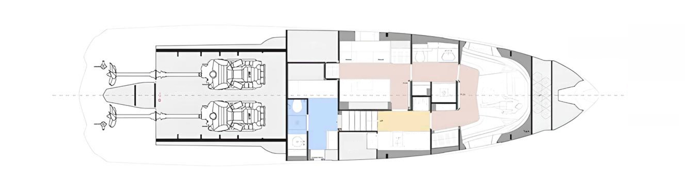 Нижняя палуба предлагает две каюты для четырёх гостей с современным оформлением и премиальными материалами. Для водного досуга на борту предусмотрены два Seabob Lamborghini Edition.