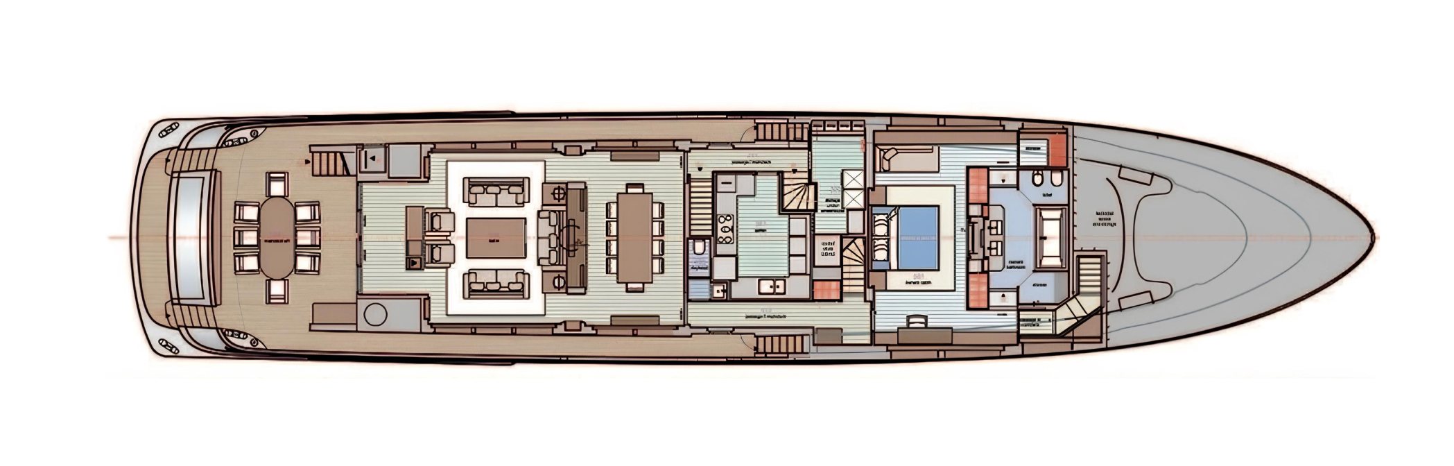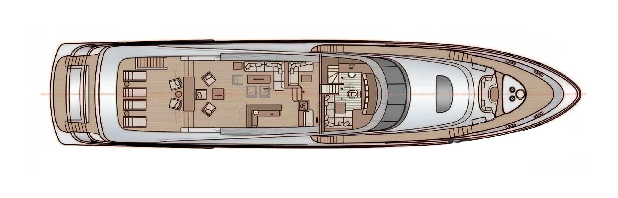 Внешние зоны включают полукрытый флайбридж с баром, лаунжем и зоной для загорания, кокпит оборудован зоной отдыха. Гараж вмещает тендер 4,5 м и набор водных игрушек, включая гидроцикл Castoldi и водный мотоцикл Sea-Doo.