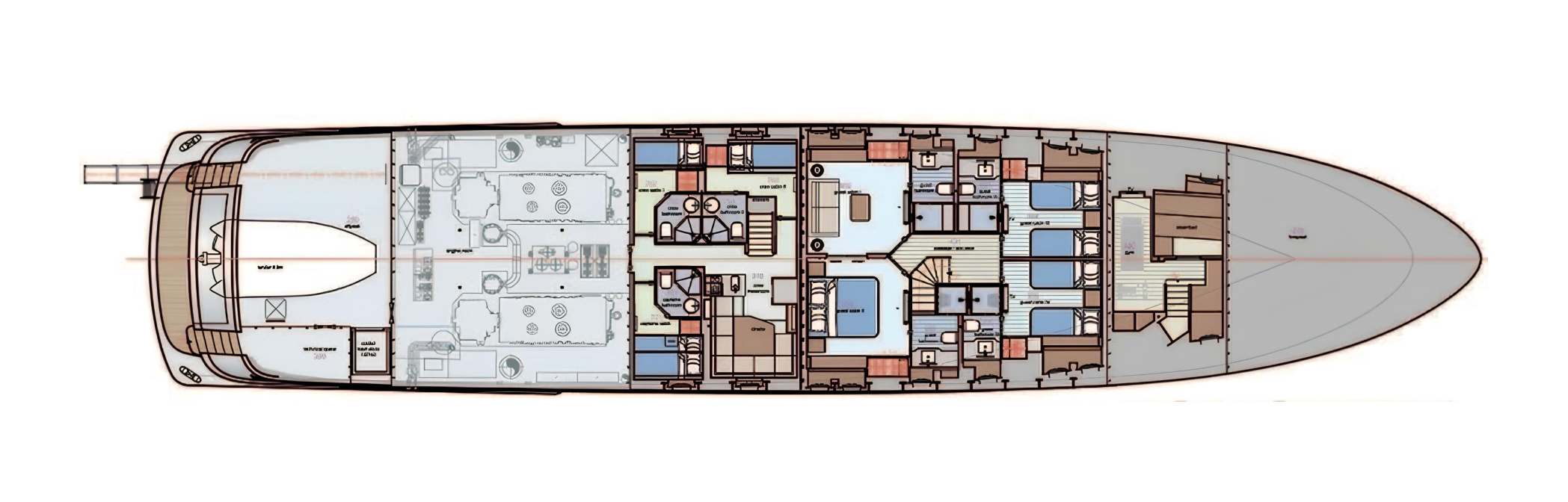 Яхта рассчитана на размещение 10 гостей в пяти каютах, включая мастер каюту во всю ширину корпуса на главной палубе с доступом к тренажерному залу и паровой бане. Две VIP-каюты и две двухместные каюты с ванными комнатами расположены на нижней палубе и обеспечивают приватность и комфорт.