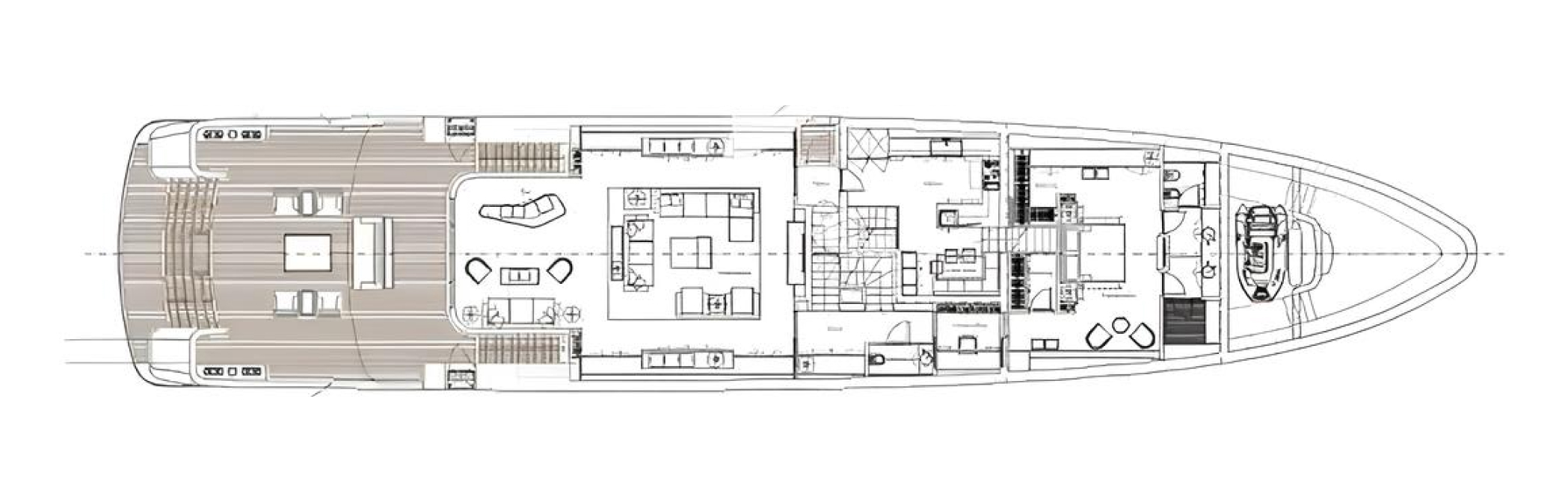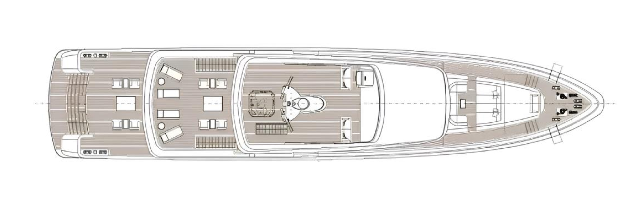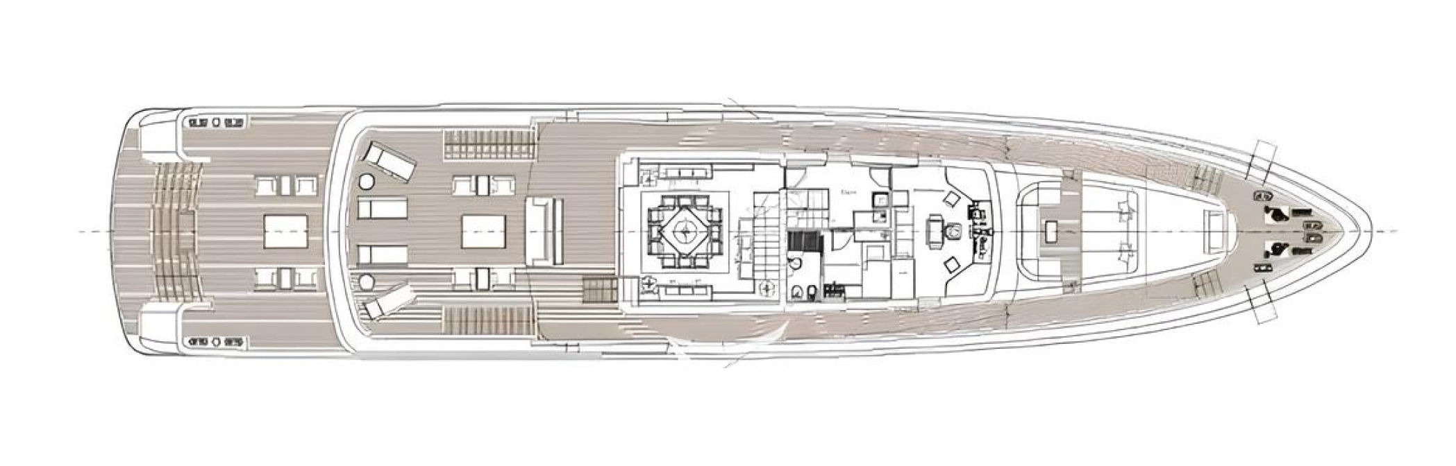 Экстерьер ASLEC 4 включает просторные зоны отдыха, такие как 70-метровая кормовая палуба, главная палуба с лаунж и баром, а также сандек оснащенный джакузи, шезлонгами и зонами для обедов. Пляжный клуб с хаммамом и откидной террасой предоставляет прямой доступ к морю.