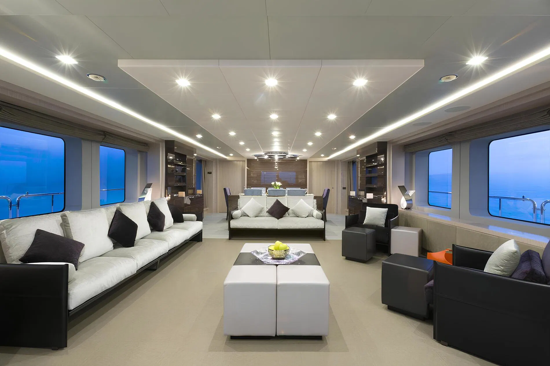 Светлые интерьеры от Zuretti с панорамным остеклением главного салона
