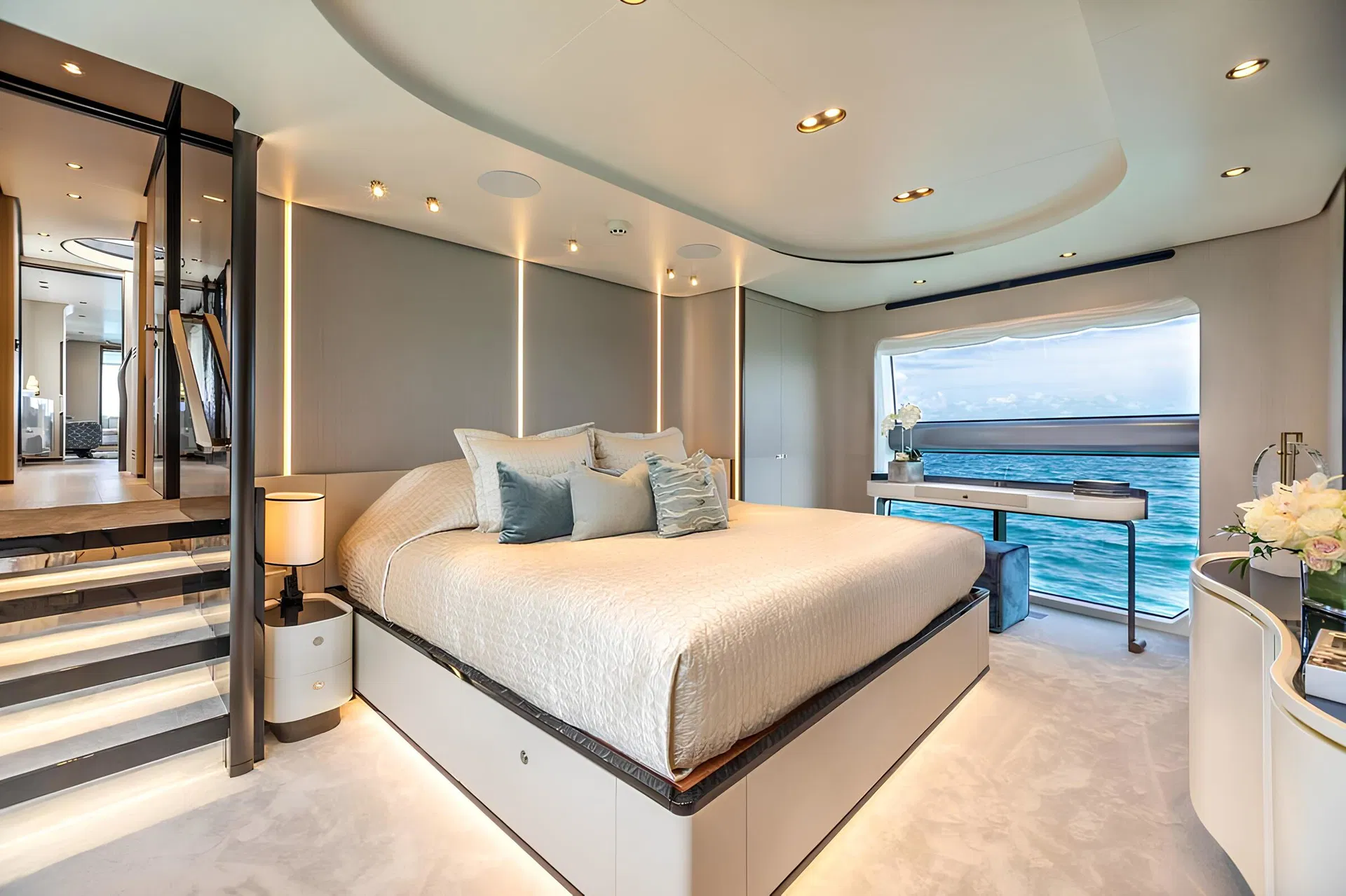 Мастер-каюта расположена на главной палубе во всю ширину корпуса - приватный апартамент с панорамными окнами от пола до потолка, большой кроватью king-size, зоной отдыха, рабочим столом и вместительной гардеробной. На нижней палубе - две VIP-каюты с кроватями queen-size и две гостевые каюты (одна из них трансформируется в king-size). Всего комфортное размещение до 10 гостей в 5 каютах с отдельными ванными комнатами, кондиционированием и полным Wi-Fi-покрытием.