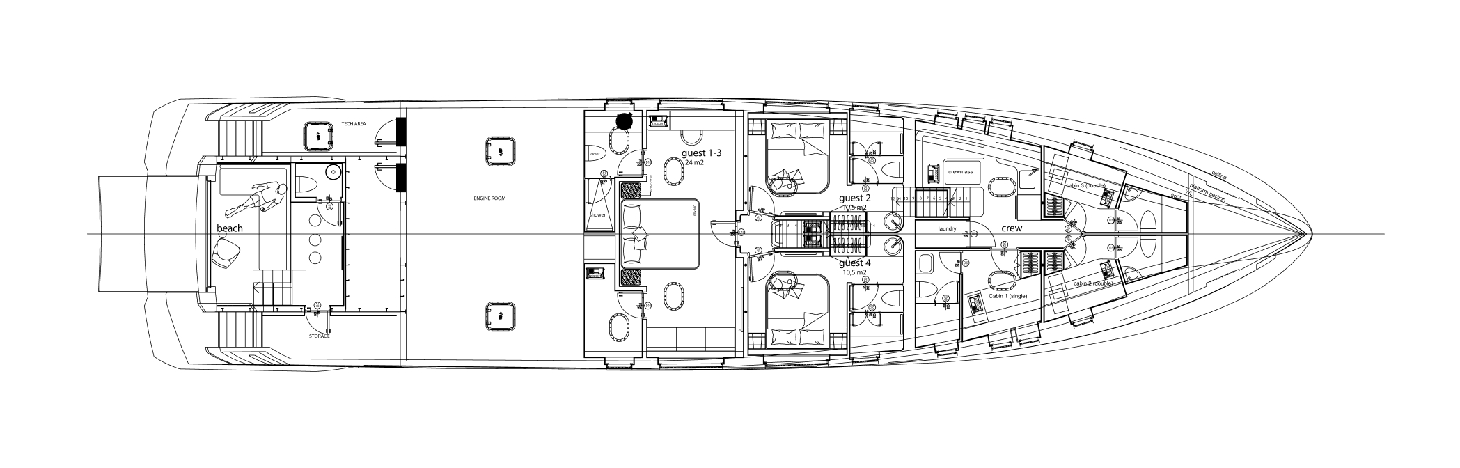 The interior layout includes six cabins for the owner and guests, among them a full-beam master suite of approximately 28 square metres with a private lobby, a VIP cabin located on the upper deck, and four additional guest cabins. Crew accommodation is arranged separately and includes a dedicated captain’s cabin, with space for up to five crew members, allowing for professional service during extended voyages.