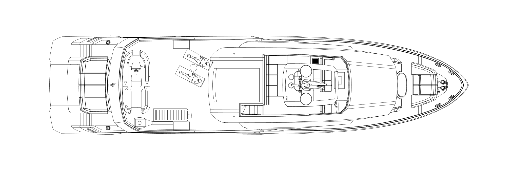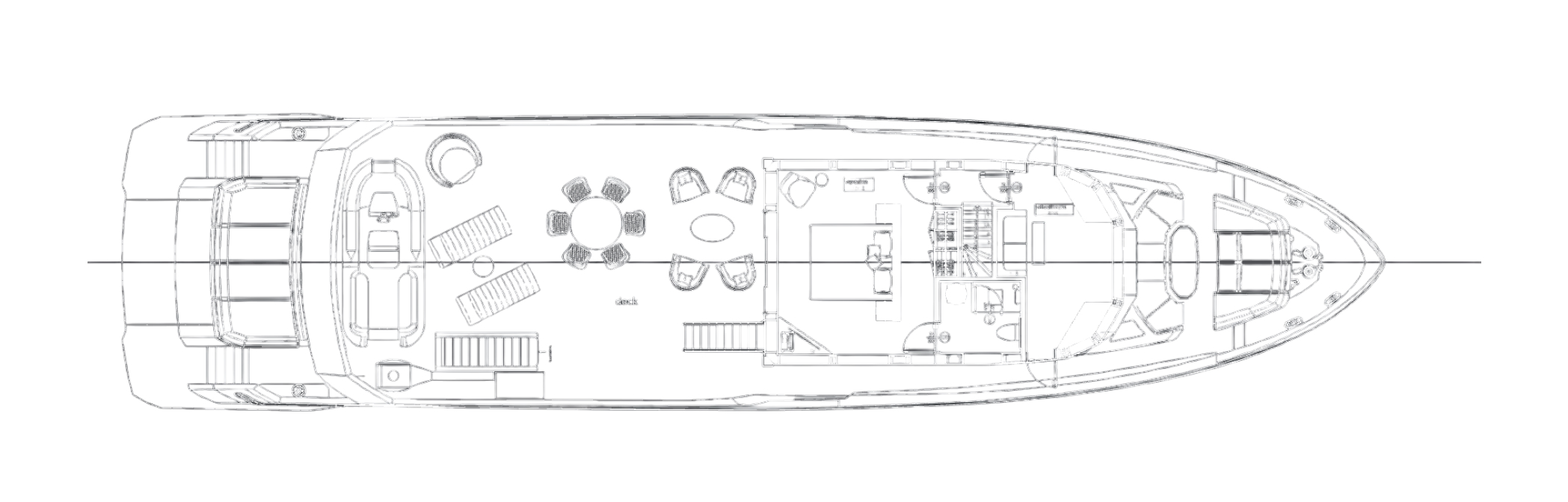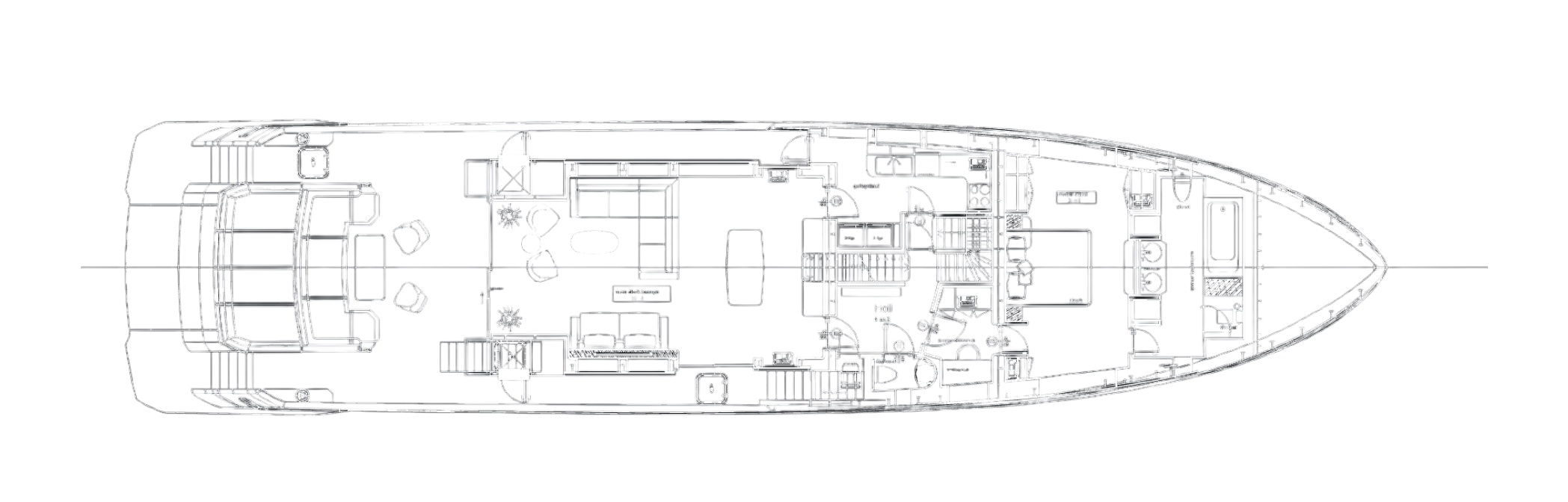 Outdoor areas are distributed across three decks. The upper deck offers around 65 square metres of usable space for relaxation and socialising, while the aft section features a beach club of approximately 22 square metres with direct access to the water. All exterior decks are finished in teak and designed for practical, durable use during long passages.