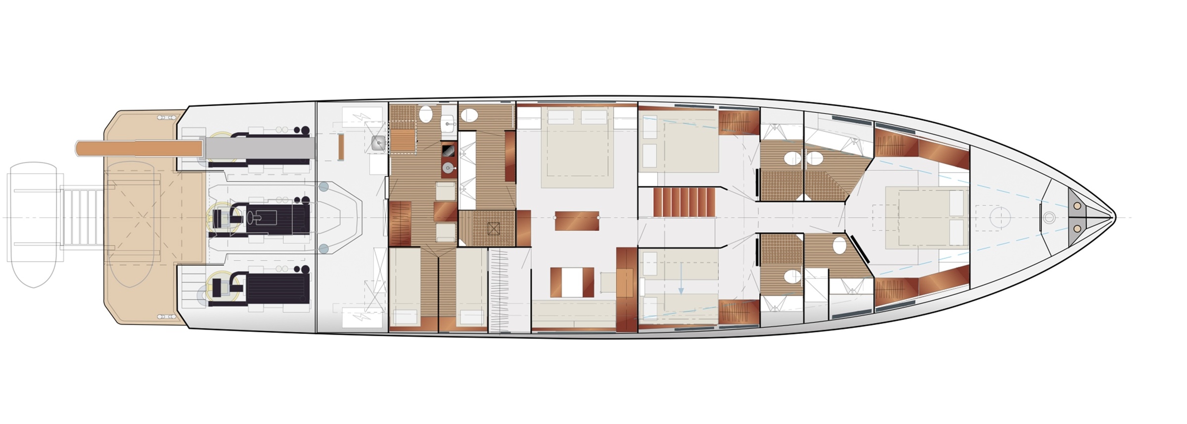 The layout accommodates up to eight guests across four cabins, including a full-beam master suite with a king-size bed, a VIP cabin, and two twin guest cabins - all with en-suite bathrooms. A crew of up to four is housed in separate quarters.