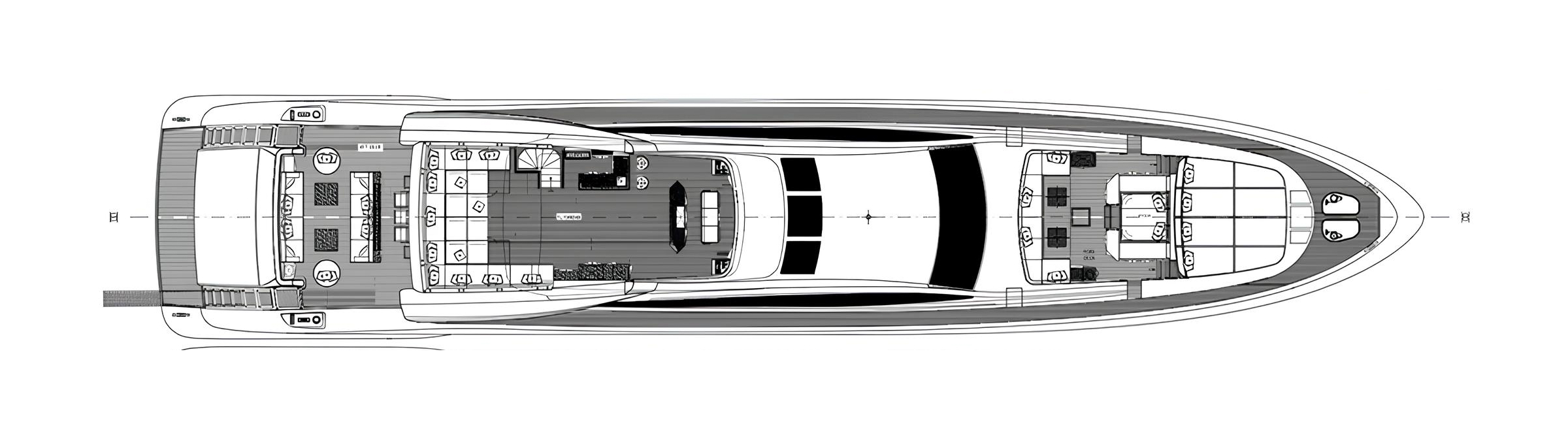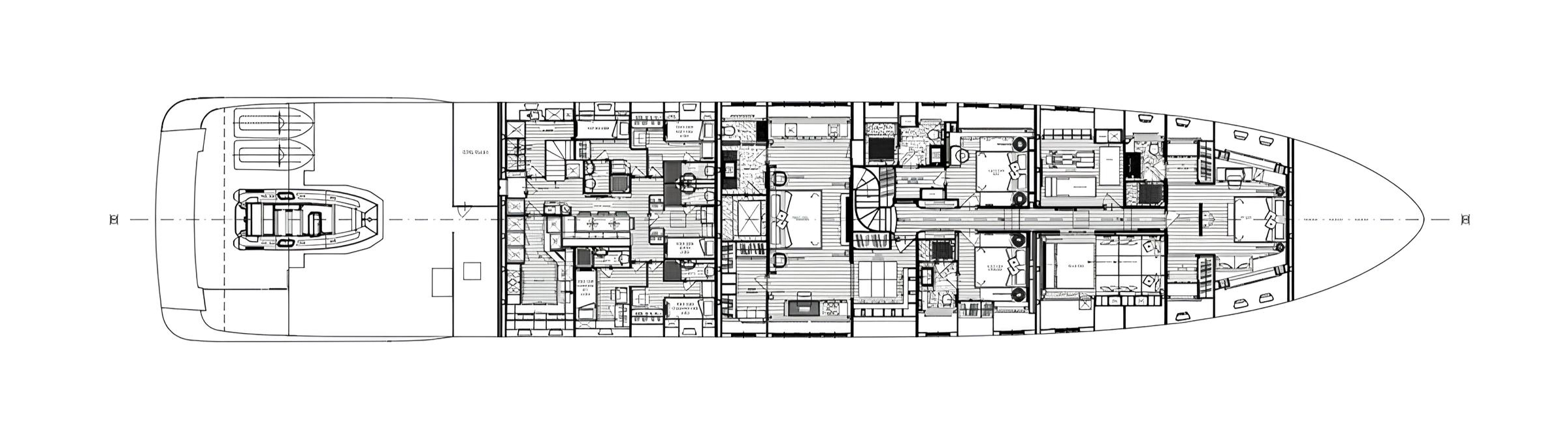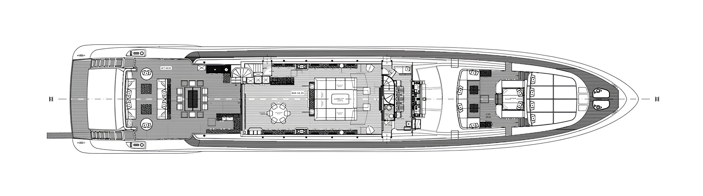 The main salon flows seamlessly into the aft deck, offering bar, dining, and lounge spaces. Outdoor decks include a forward area with a Jacuzzi, sun loungers, and seating; a sunbathing zone with bar and DJ station; and a beach club with swim platform and garage for tenders and water toys.