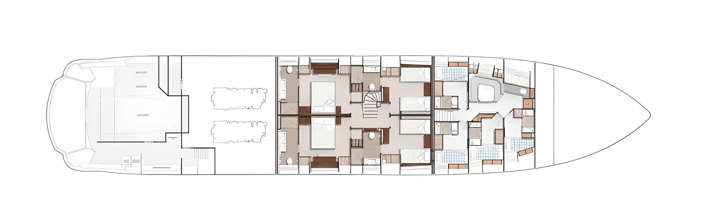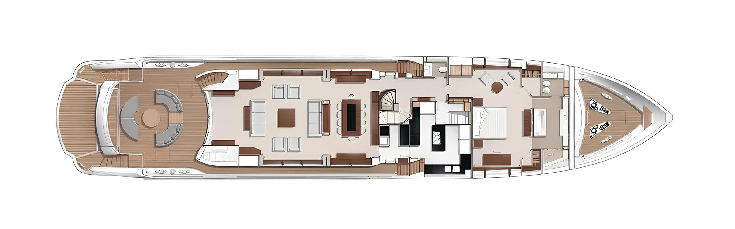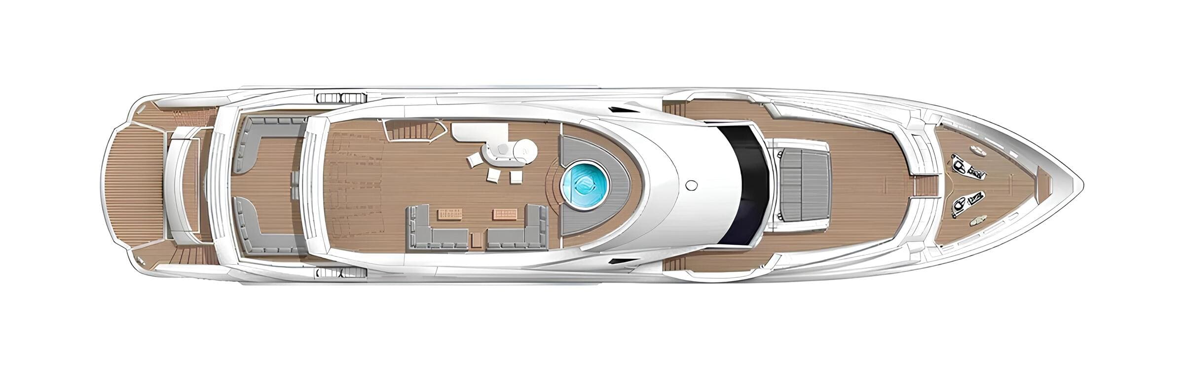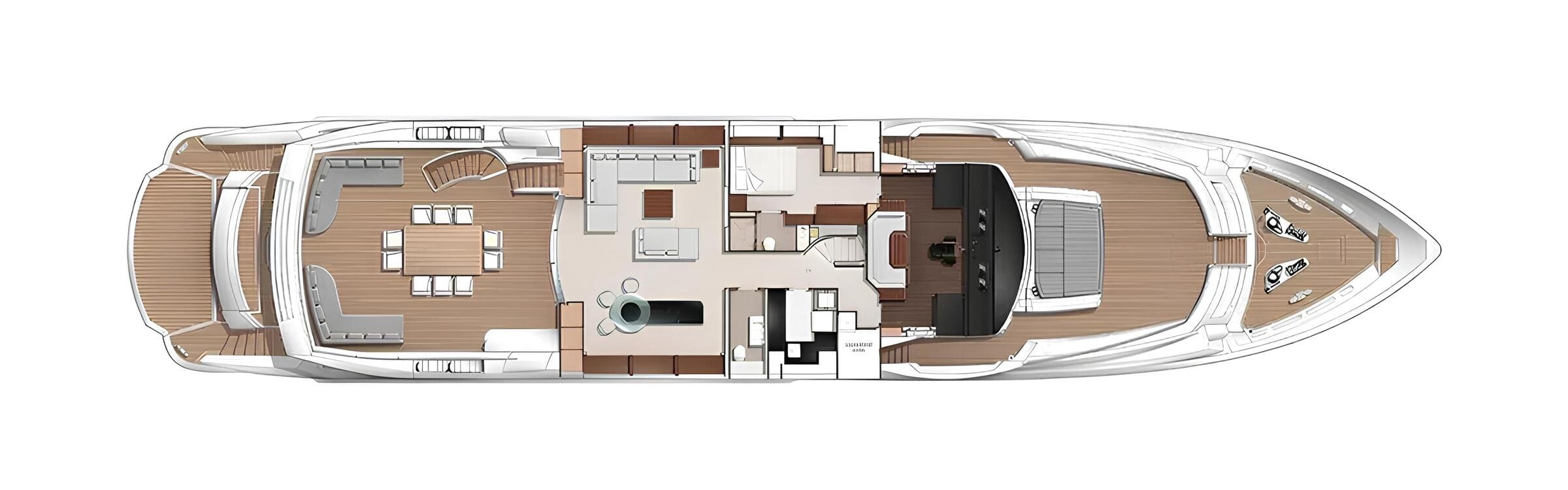 The main deck hosts a bright salon, a separate dining area and a fully equipped galley. The upper deck features a skylounge with games table, sofa, TV, bar and direct access to the aft terrace for al fresco dining. The sundeck offers a central lounge and dining area under a hardtop, plus a forward section with jacuzzi, bar and stools, and a sunbathing area aft.
