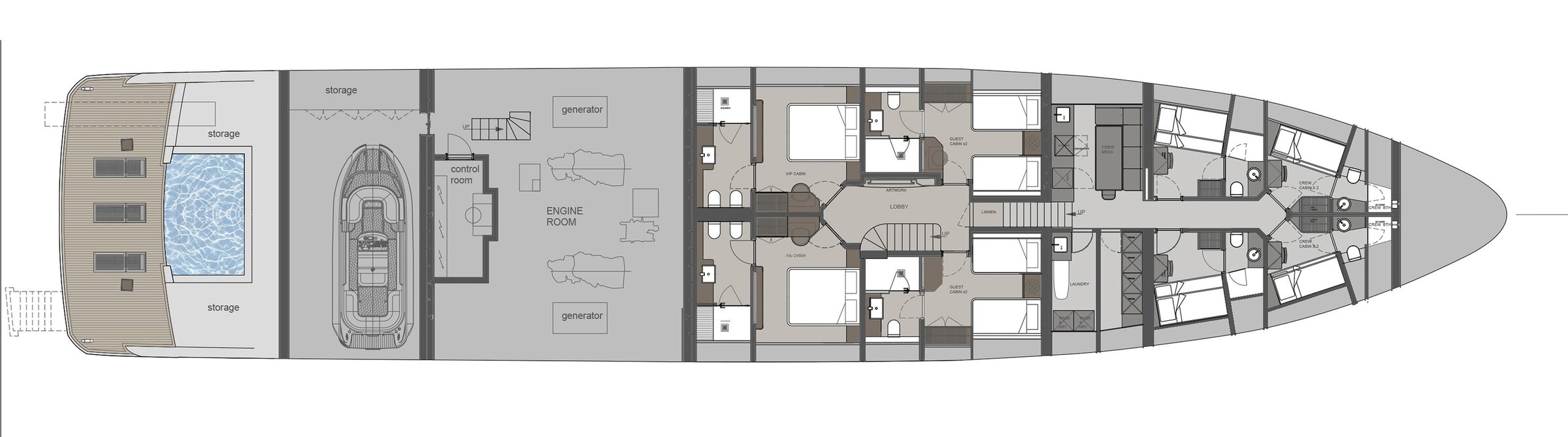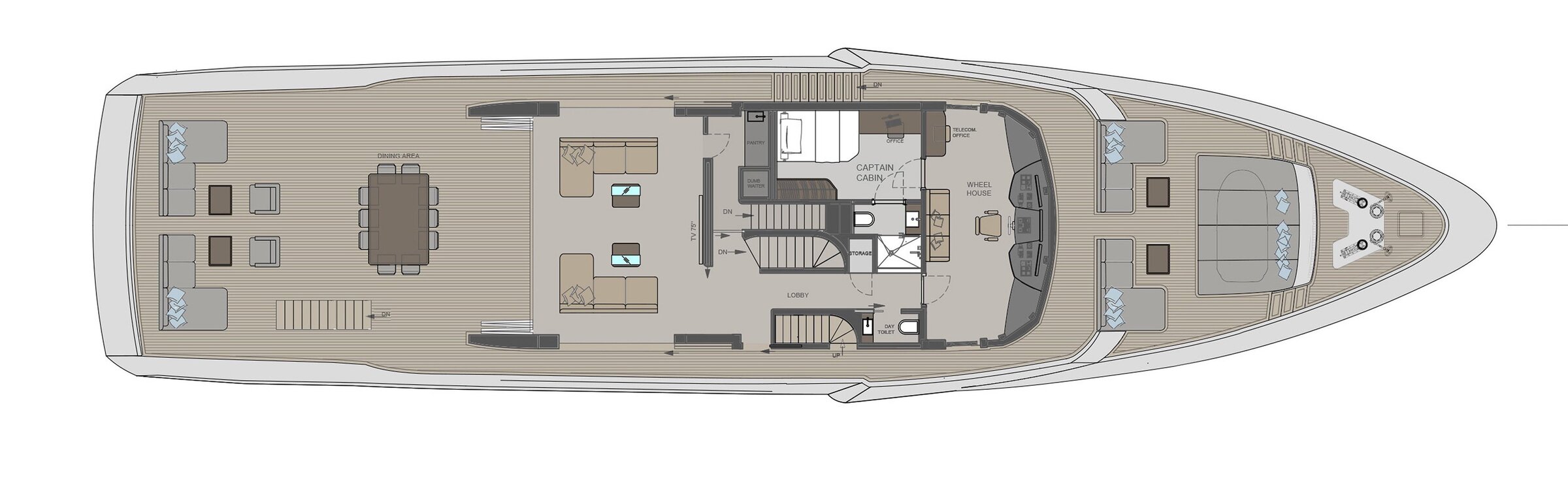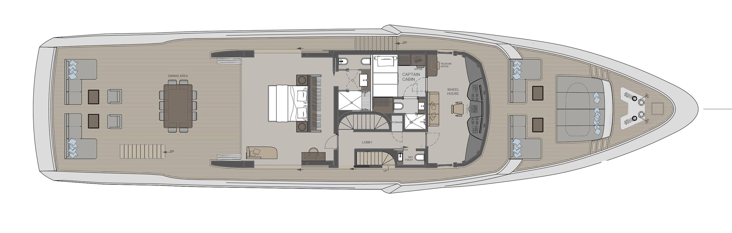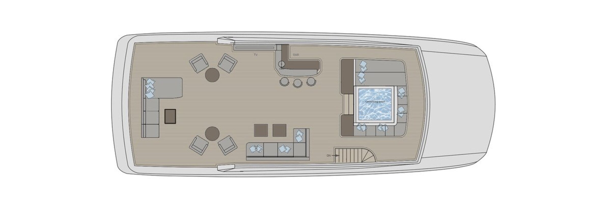 Accommodation is provided for 12 guests across six cabins, including a bright and airy master suite with the option to be located on the upper deck. The 9-member crew has comfortable and functional quarters. Outdoor leisure is enhanced by two jacuzzis, located on the aft deck and the sundeck.