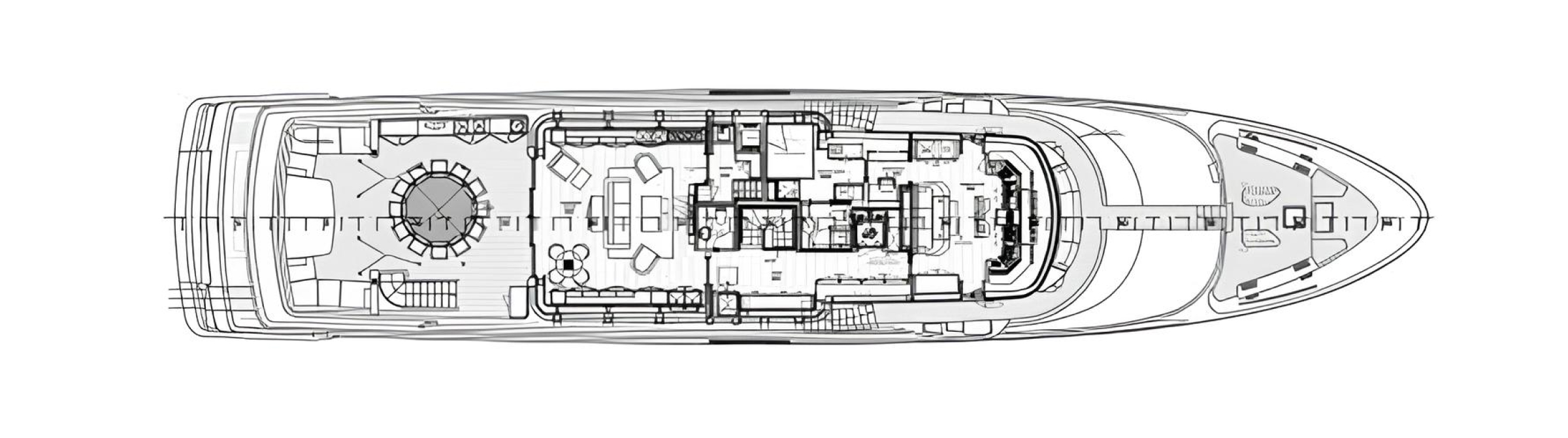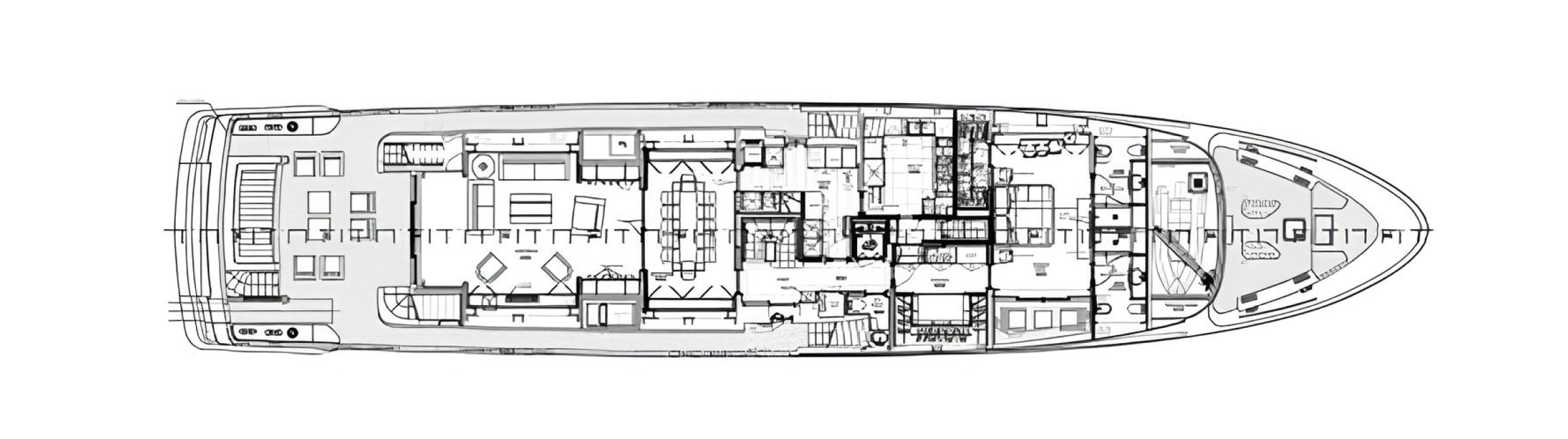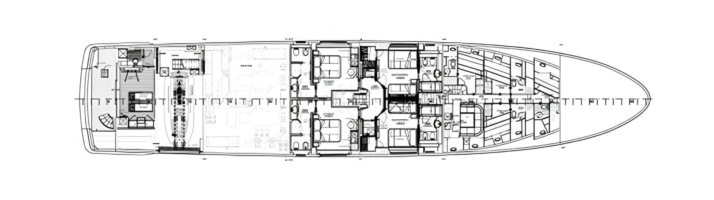 Her layout accommodates up to 12 guests in 5 staterooms, including a main-deck master suite with private balcony, two VIP cabins, and two twin cabins. Up to 9 crew are housed in a separate area, ensuring the highest level of service and guest privacy.