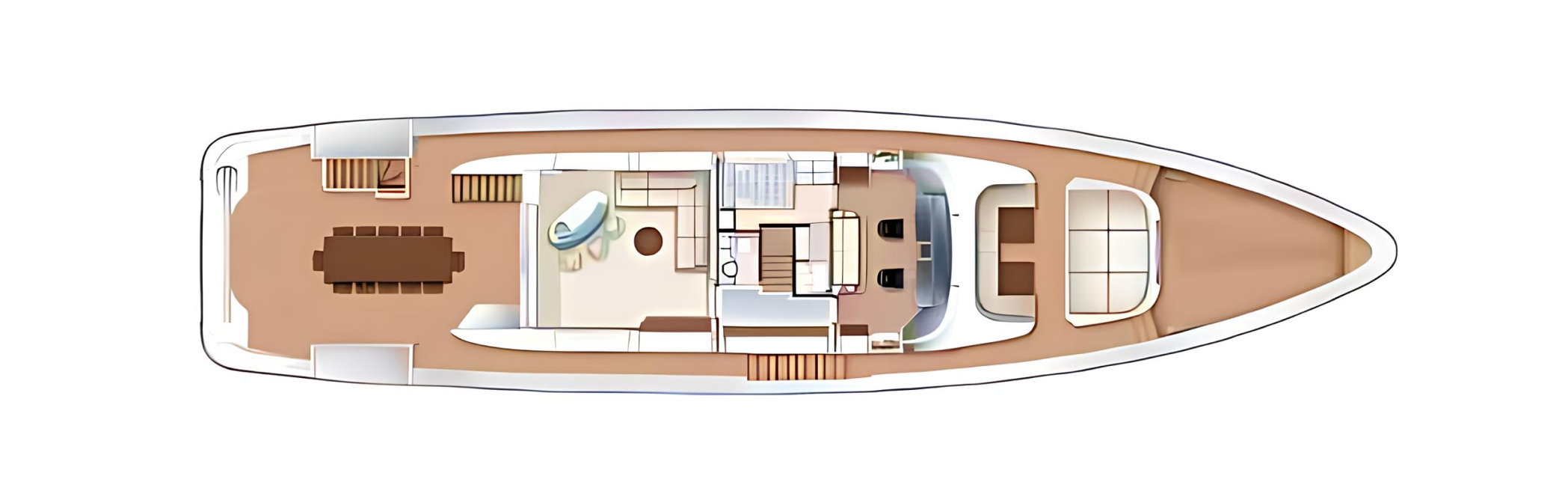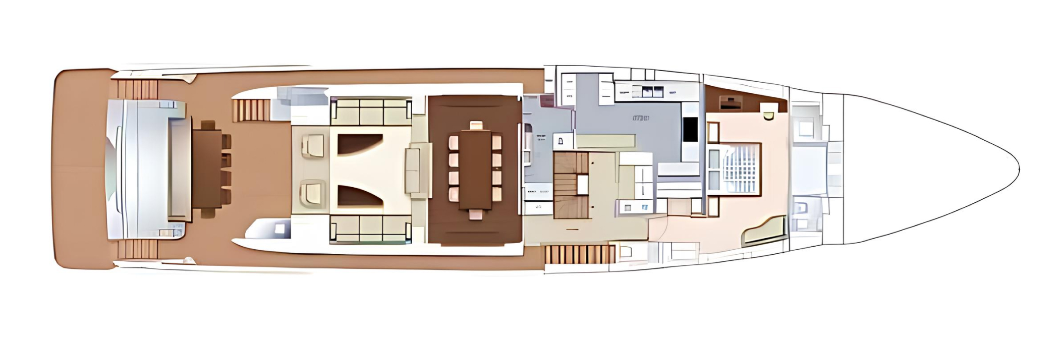 Expansive outdoor living areas include dining zones on the aft main and upper decks, plus lounging and sunbathing spaces on the sundeck and foredeck.