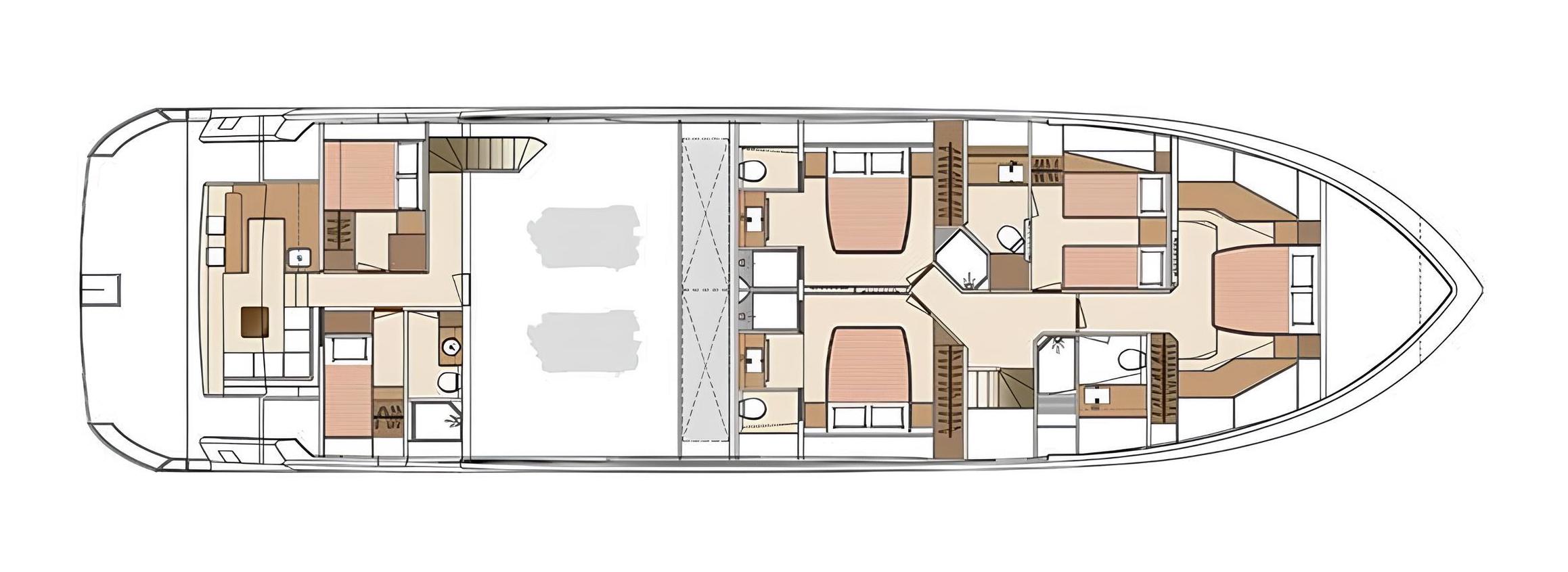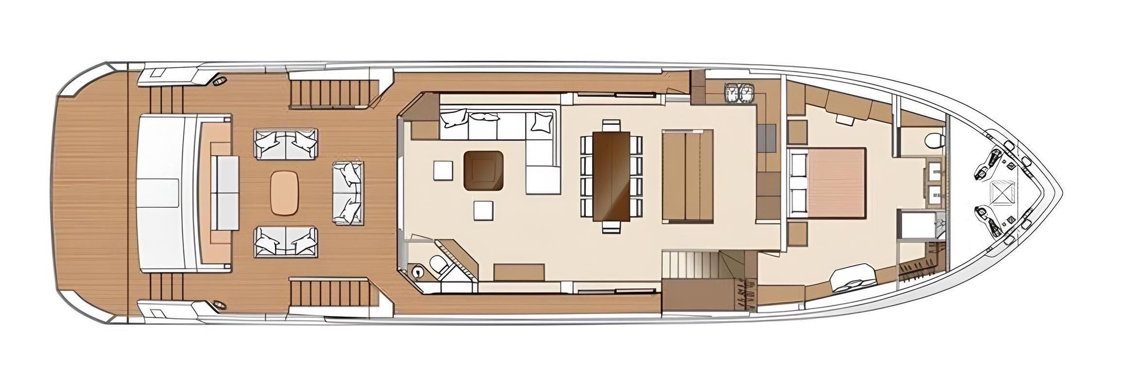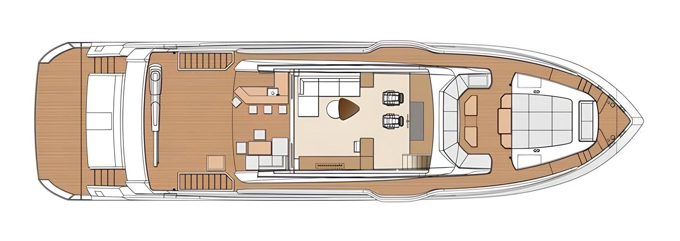 On the flybridge, guests can enjoy a fully enclosed lounge and an open-air area with a well-equipped bar and dining space – the perfect setting for evening cocktails or relaxed gatherings.