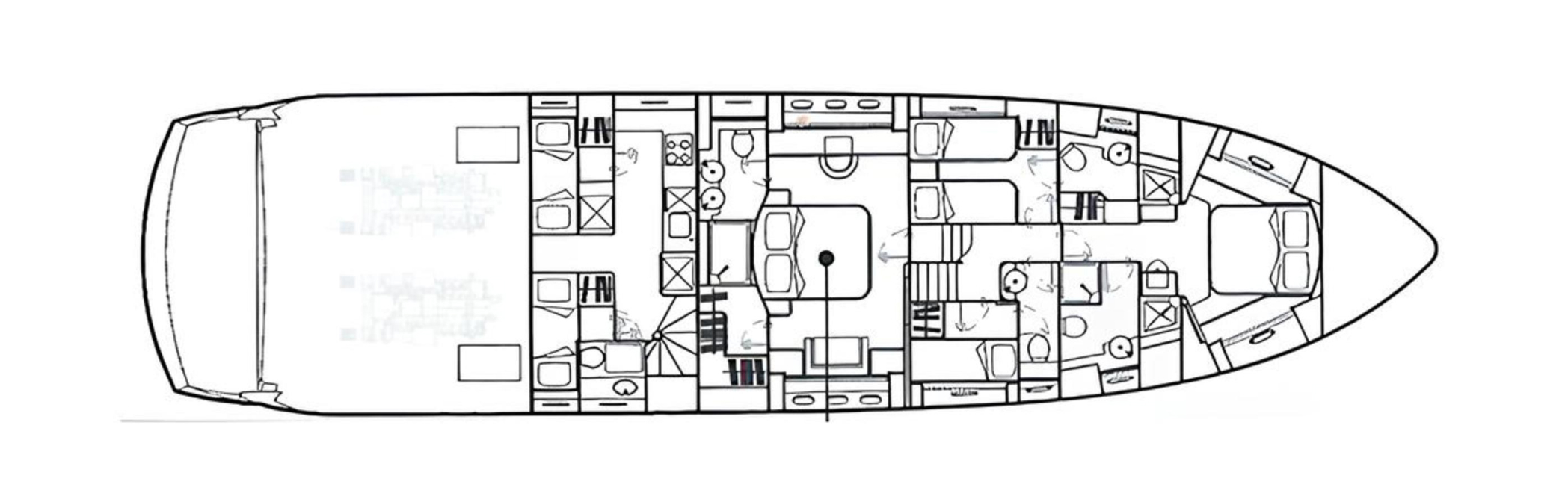 Accommodation includes four guest cabins: a full-beam master suite, a forward VIP, and two guest cabins to port and starboard. Crew quarters accommodate two to three crew members, and the lower deck houses a galley and storage areas.
